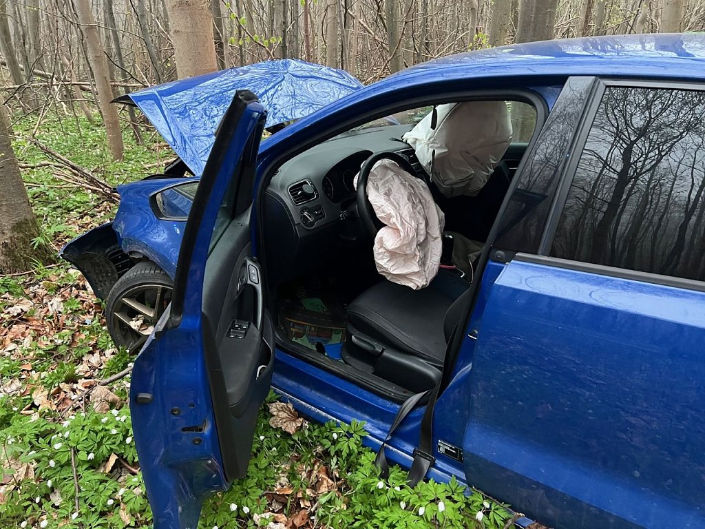 ...als sie am Ausgang einer Linkskurve aus bisher ungeklärte Ursache von der Fahrbahn abkam, durch den Straßengraben fuhr und anschließend an einen Baum prallte.