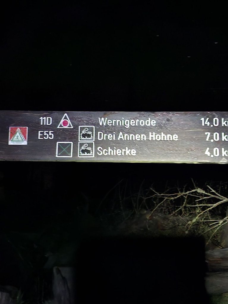 Beim Brockenbauern in Tanne gab es kurz vor Schließung 21 Uhr noch kurz ein alkoholfreies Weizen, weiter über den Schierker Weg Richtung Elend. So langsam wurde es dunkel, die Wege gingen teils durch feuchte Senken im Wald, Zeit sich per Stirnlampe und ausreichender Geräuschkulisse bei der Tierwelt bemerkbar zu machen. Im letzten Jahr hatte ich hier eine Begegnung mit einer größeren Wildschweinrotte. In diesem Jahr sind sie angesichts Lichts und grauslichem Singen wohl geflüchtet.