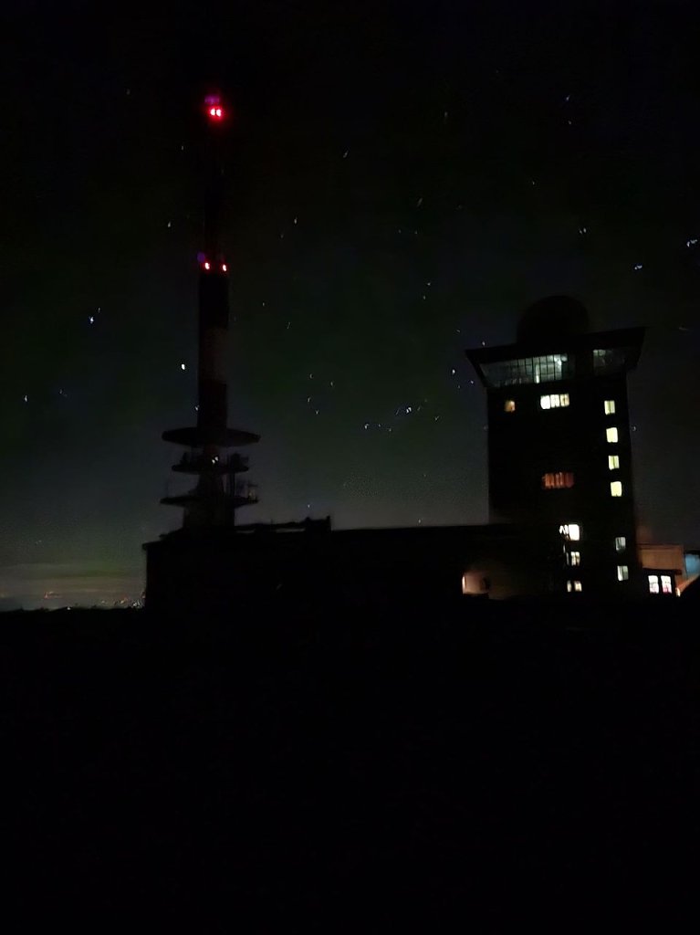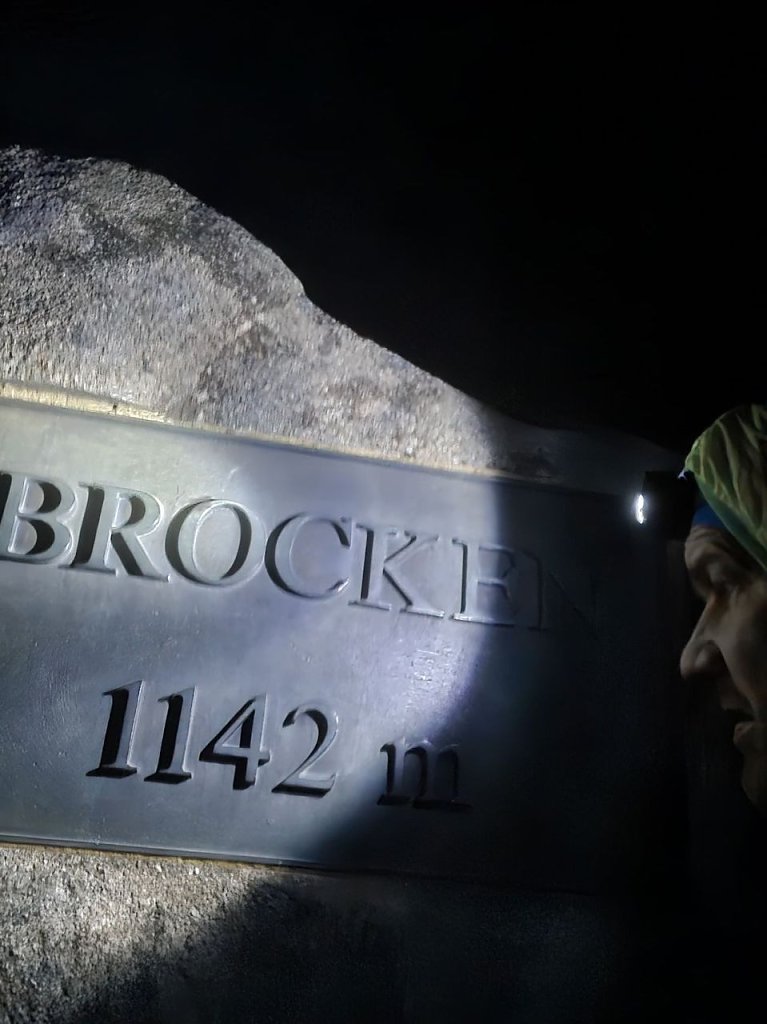 Nach 42 km und knapp 9 Stunden erreichte ich gegen 1 Uhr den Brockengipfel. Mit viel Glück hatte ich eine windstille, sternenklare Nacht mit einer tollen Aussicht. Es ist schon erstaunlich wie hell die Orte nachts um 1 Uhr leuchten. Ich war schon oft zu Sonnenauf- und untergängen auf dem Brocken, den nächtlichen Blick finde ich am beeindruckendsten. Der Einzige der mir auf dem Plateau begegnete war ein junger Fuchs der mich länger erstaunt ansah, und erst als ich die Handykamera zückte davonschlich.