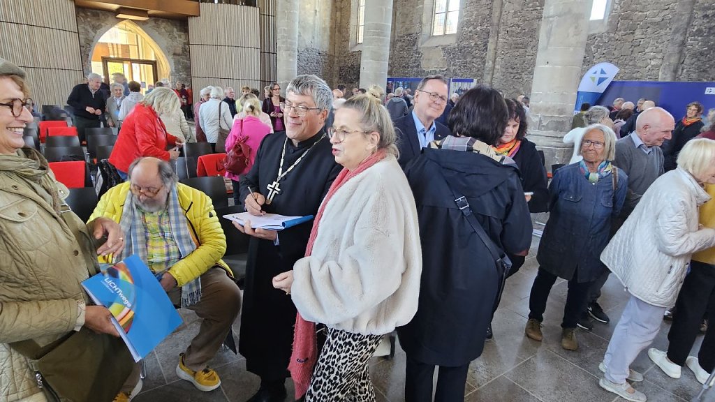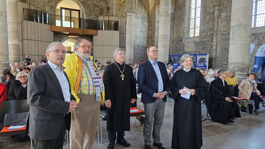 Ein Gottesdienst eröffnet die Festveranstaltung. Musikalisch begleitet von Sebastian Hennemann, Solo-Violoncello beim Loh-Orchester, sowie dem Ilfelder Gospelchor Gospel Generations und dem Ellricher Singkreis unter Leitung von Kreiskantorin Christine Heimrich. Die Initiatorin und Projektleiterin der LICHTwege Pfarrerin Sabine Wegner predigt. Das häufige Nicken des Künstlers zeigt die enge Verbundenheit der beiden, die sich im Laufe des letzten Jahres entwickelt hat. Die Pfarrerin spricht ihm aus der Seele. Seine Kreuze sind Kreuze der Hoffnung, der Auferstehung, nicht des Leidens, das ist ihm wichtig. Die folgenden Grußworte von Landesbischof Friedrich Kramer und von Bundestagsvizepräsident Bodo Ramelow sprechen die Menschen an. Ihr Band zum Künstler ist schnell geknüpft. Sitzt doch der Bischof fröhlich zwischen den beiden ehemaligen Gewerkschaftlern Ludger Hinse und Bodo Ramelow – beide gläubig.