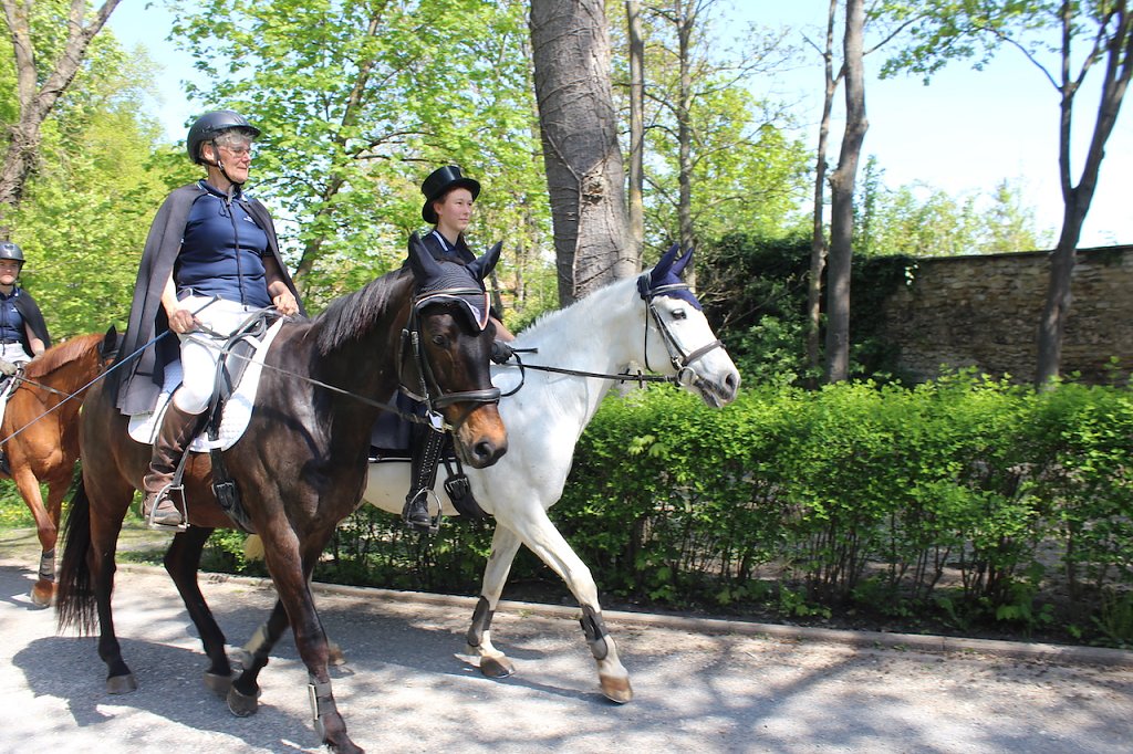 Novalisritt: Die Reiterinnen des "Gestüts Hainleite aus Niederbösa" erreichen das Seniorenzentrum Am Waidhof der Novalis Diakonie in Schloss Sophie von Kühn in Grüningen (Foto: Eva Maria Wiegand)
