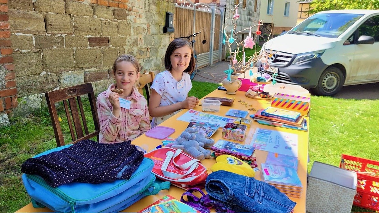 Die beiden neunjährigen Freundinnen Joulina und Frieda organisierten mit viel Einsatz einen eigenen Flohmarktstand, bei dem sie Spielsachen, Bücher und kleine Schätze aus ihren Kinderzimmern anboten. Die Einnahmen in Höhe von 210 Euro wurden für zwei gute Zwecke gesammelt: Zum einen für die regionale Grundschule, zum anderen für den Wunscherfüllerwagen, der schwerkranken Kindern ihre letzten Herzenswünsche erfüllt.