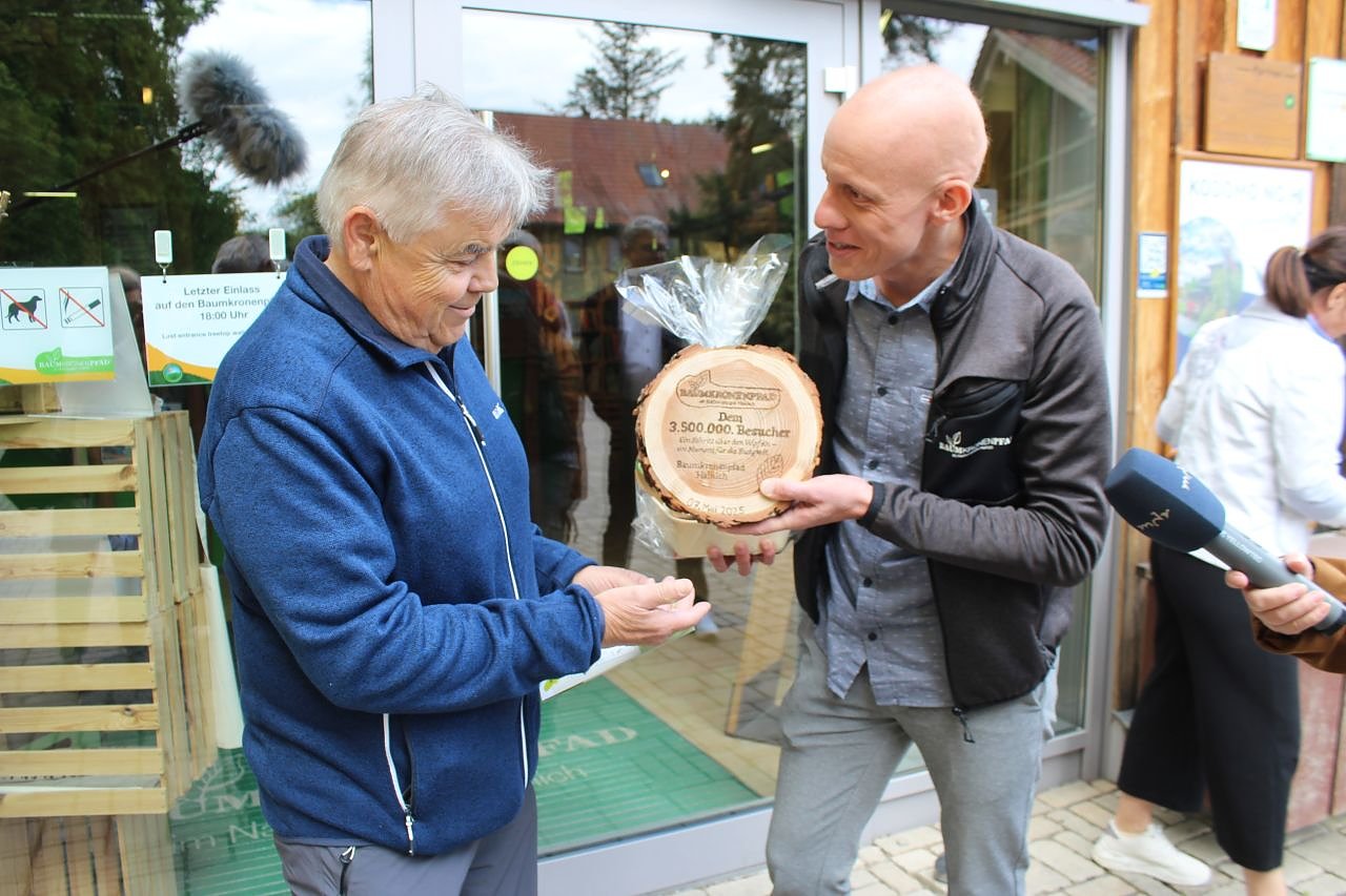 Jo mei, wird sich der Herr aus Mittelbayern gedacht haben, als er heute Nachmittag vom Betriebsleiter des Baumkronenpfades, Michael Zilling, am Portal des Empfangs- und Erlebnisbereiches abgefangen, begrüßt und mit einem Geschenk als der Dreimillionenfünfhunderttausendster Besucher der Anlage vor den Toren der Stadt Bad Langensalza geehrt wurde...
