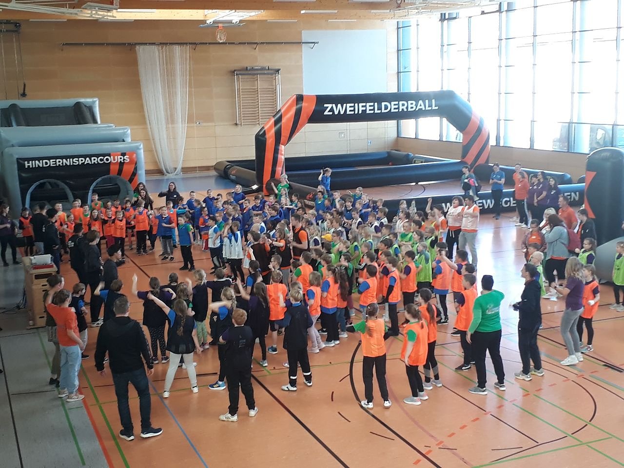 Anschließend wurden die Kinder in bunte Gruppen eingeteilt und nach einer schwungvollen Erwärmung nahmen die Kids die aufgeblasenen Eventmodule einer Bochumer Firma in Beschlag, an denen es unterschiedliche Disziplinen zu absolvieren gab. Im Außenbereich hatte der Rehasportverein Mühlhausen, in Person von Martina Dorenwendt und Marco Pompe wieder den beliebten Rollstuhlparcours aufgebaut und spielte mit den Schülern die Trendsportart Streetracket.