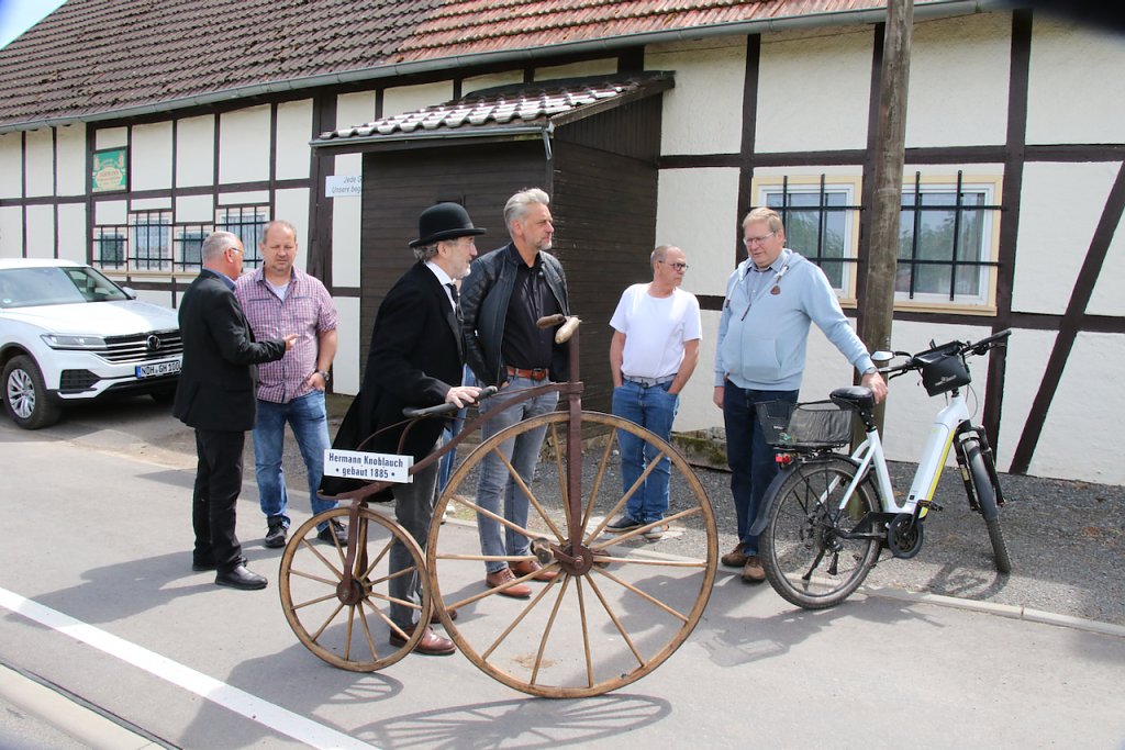 Das Panorama entlang des Weges zeigt sich denn heute auch von seiner besten Seite, Sonnenschein und leichter Wind, im Hintergrund lugt die Ebersburg aus dem Grün. Die Zierde auf dem Radweg bot Gerhard Knoblauch auf, der mit dem vielleicht ältesten Fahrrad im gesamten Landkreis vorfuhr. Das Gefährt Marke Eigenbau wurde vom Urgroßvater Hermann Knoblauch anno 1885 angefertigt und kommt ohne Gänge, Federn oder auch nur Bremsen aus, von den Elektromotoren der Moderne ganz zu schweigen. Für den Rahmen wurde der Dorfschmied verpflichtet, Stellmacher Knoblauch sorgte dafür, dass an den hölzernen Speichen nichts wackelte und das ist auch nach gut 150 Jahren immer noch so. Echte Handwerkskunst.