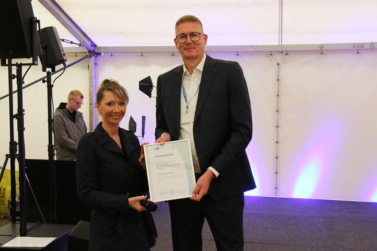 Eine solche Nachwendegeschichte ist auch die der Firma Kurth Bohrtechnik. Lutz und Urusula Kurth, beide studierte Hydrogeologen, verlieren wie so viele andere auch im Umbruch ihre Arbeitsstelle. Die VEB Hydrogeologie wird aufgelöst, an Forschung und Entwicklung aus Nordhausen besteht kein weiteres Interesse. Eigene Wege muss man gehen, Anfang der 90er Jahre bietet man als Brunnen- und Erdbau Herrmannsacker fachmännische Dienste feil, baut Kontakte auf und geht ab 1993, nun als Ingenieurbüro, in die eigene Entwicklung. Zwei Jahre später wird mit drei Mitarbeitern die Firma aus der Taufe gehoben, auf deren Grundstück seit gestern die Geoworld ausgerichtet wird, eine Messe für Bohr- und Brunnentechnik mit Gästen aus der ganzen Republik und vielen Freunden und Geschäftspartnern.