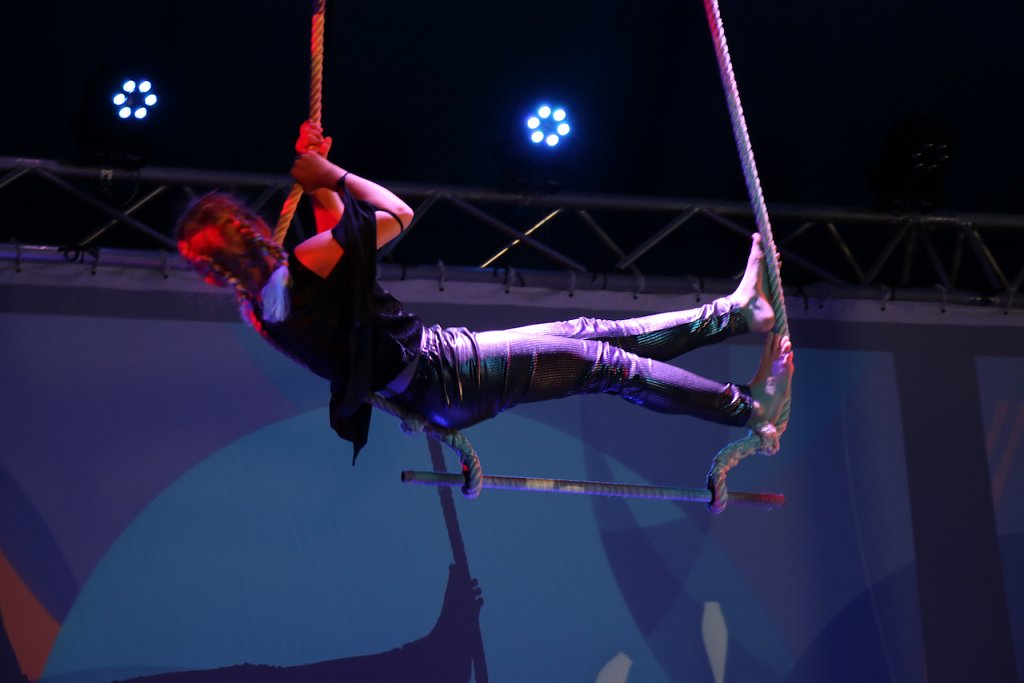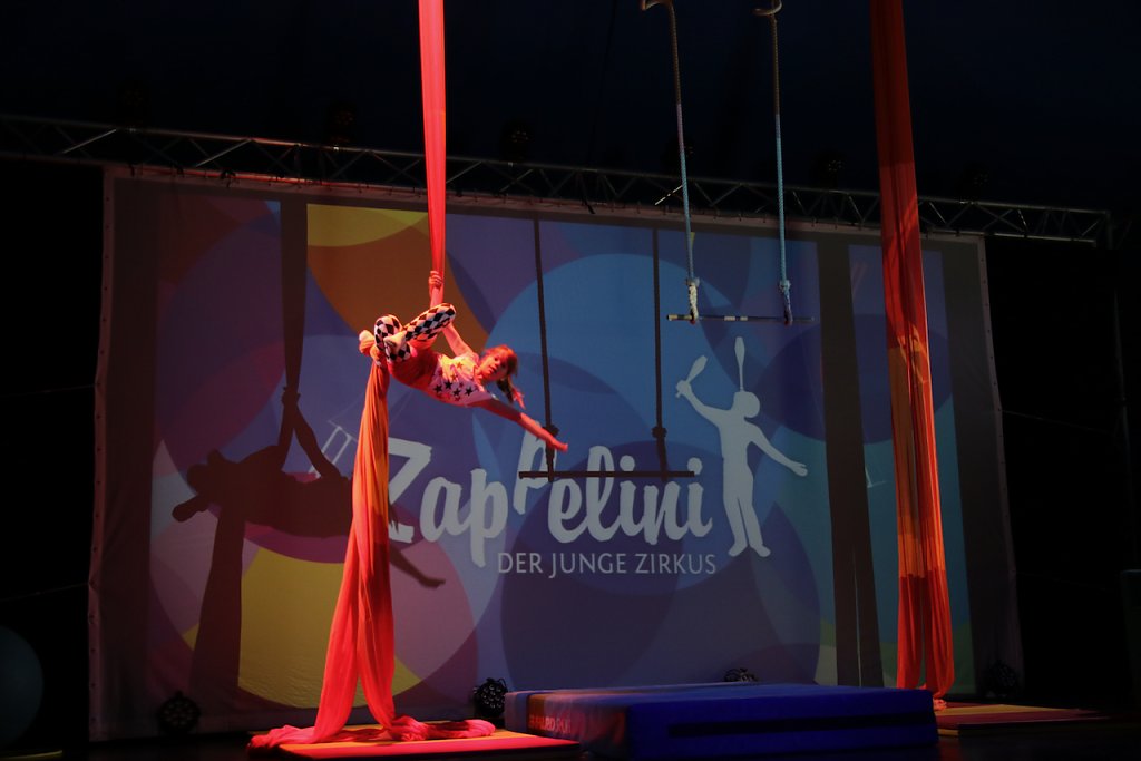 Und was die auf die Bühne bringen ist und bleibt eindrucksvoll. Bald drei Meter über dem Boden am Trapez zu balancieren, allein den Mut dazu aufzubringen sich in die Höhe zu schwingen, dass kann man nicht mal eben einfach so lernen und nicht irgendwo. Das braucht Zeit, Disziplin, Technik, Anleitung und den richtigen Ort. Und doch lassen es die Kinder auch heute wieder leicht aussehen, ob im Tuch, auf dem Einrad oder am Trampolin.