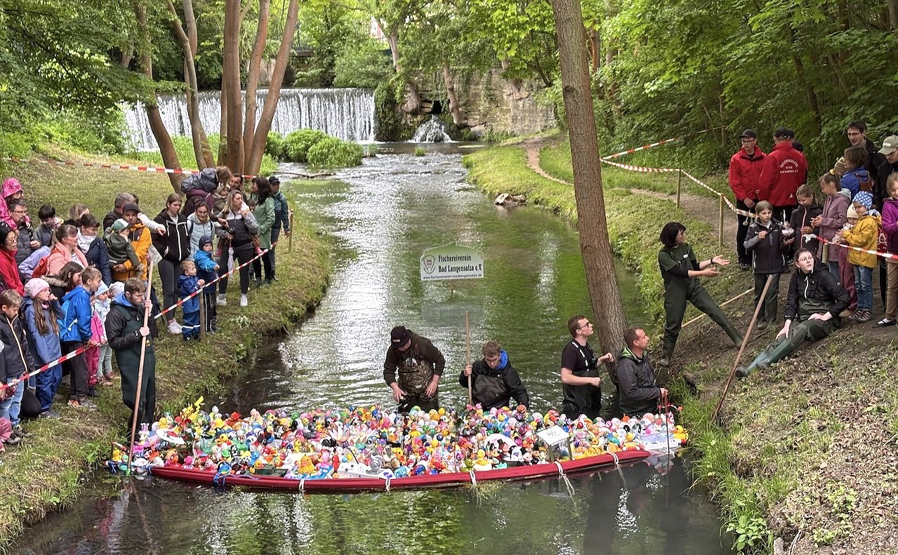Auf der Salza schwammen heute Vormittag mit heißem Start um 11 Uhr wieder 666 Enten um den Sieg. Bereits ab 9 Uhr konnten sich die Wettkämpfer registrieren und wie immer artete das Geschehen an der Seufzerbrücke zu einem kleinen Volksfest mit Livemusik (Spielmannszug) und viel Tamtam aus.