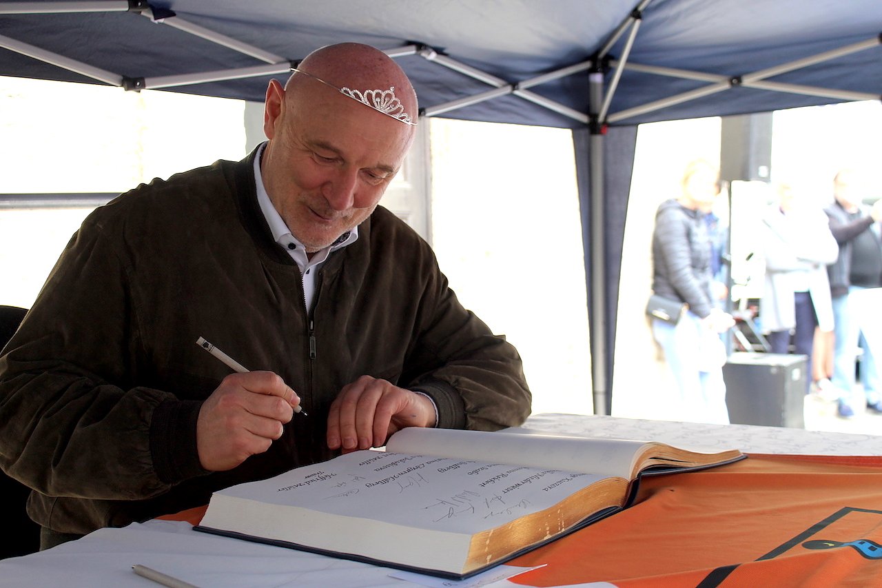 Herbert Müller, Trainer des Thüringer HC und Vater des Erfolges, trägt sich in das Goldene Buch der Stadt Bad Langensalza ein (Foto: Eva Maria Wiegand)