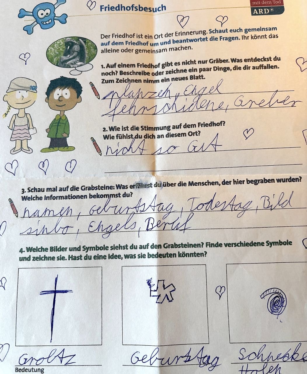 Tag drei der Projektwoche untersucht die große Frage der Menschheit: Was passiert nach dem Tod?. Die Kinder philosophieren unter Anleitung darüber, was aus dem einzigen Leben, das uns zur Verfügung steht, gemacht werden kann und wie wir dabei mit dem Lebensende umgehen. Wir wollen den Kindern bewusst machen, wie kostbar das Leben ist und dass der Tod aber dazugehört., erläutert Mary Fischer den Grundgedanken des Projekts. Eine Mappe, in der alle Stationen noch einmal aufgelistet sind, die Bastelarbeiten und Zeichnungen sowie Fotos enthält, kann jedes Kind am Ende des dritten Tages mit nach Hause nehmen.