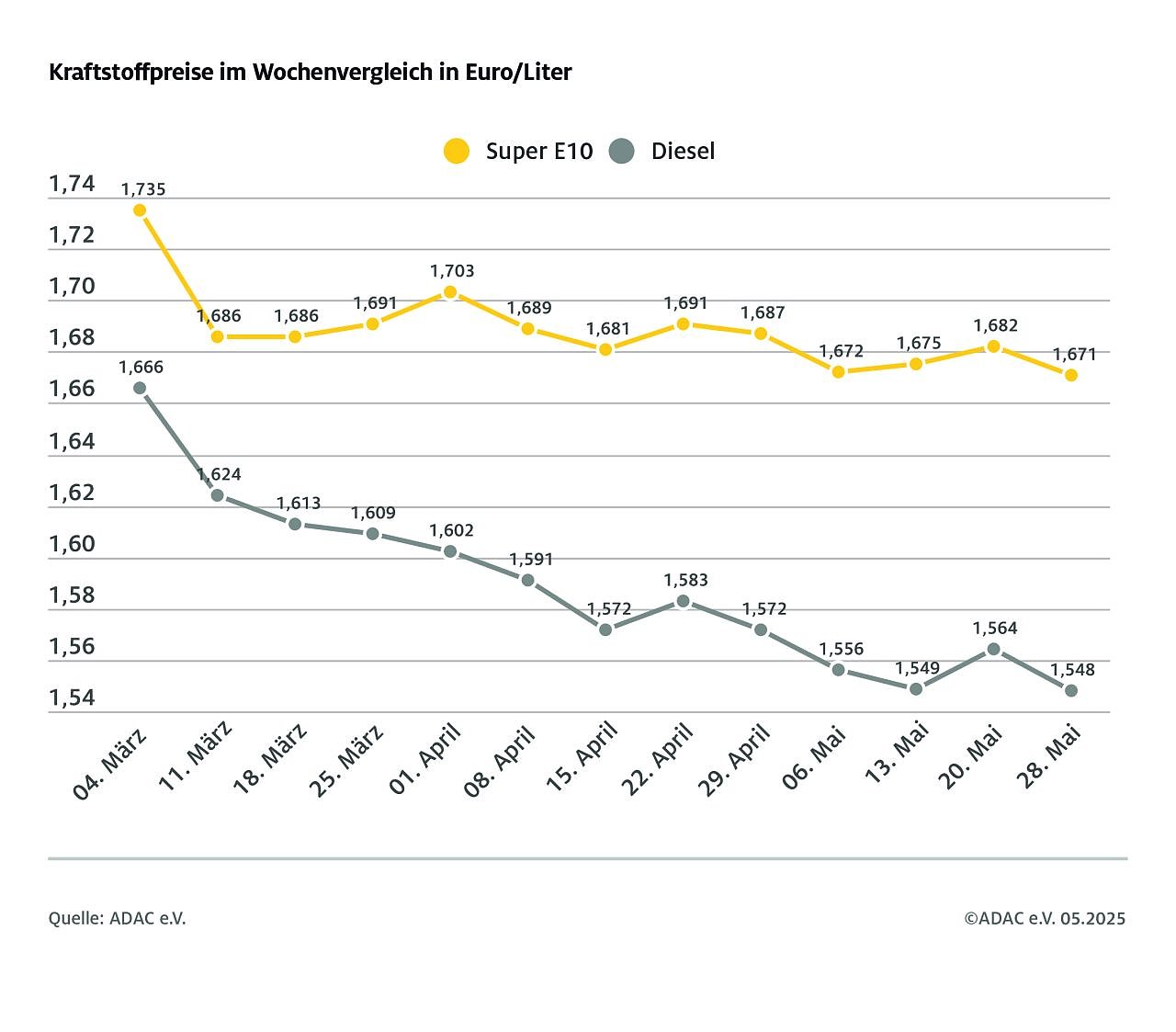 Das zeigt die wöchentliche ADAC Auswertung der Kraftstoffpreise in Deutschland. Danach kostet ein Liter Super E10 im bundesweiten Mittel 1,671 Euro, das sind 1,1 Cent weniger als vor Wochenfrist. Noch deutlicher ist der Dieselpreis gesunken: Ein Liter kostet im Schnitt 1,548 Euro, das ist ein Minus von 1,6 Cent. Die Preise beider Kraftstoffe haben in den letzten Tagen neue Jahrestiefststände erreicht.