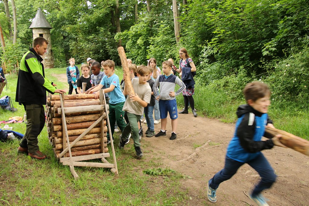 Der eigentlichen Mission tut es keinen Abbruch. Wie ehedem geht es den Förstern darum, bei den Kindern Freude an der Natur zu wecken und die Zusammenhänge zwischen Ökologie, Naturschutz und dem Arbeitsort Wald aufzuzeigen. Das geht zum einen über Spiele - im Park mussten gestern etwa Holzscheite möglichst schnell umgelagert werden, es wurde gemeinsam gesägt und gerätselt, beim Baumscheibenspiel gewann zügiges Teamwork und beim Zapfenzielwurf die Koordination. Auf der anderen Seite stehen direkte Wissensvermittlung und -abfrage. Wie heißt ein männlicher Adler? Die Grundschulkinder wissen es jetzt: der Waidmann spricht vom Terzel.