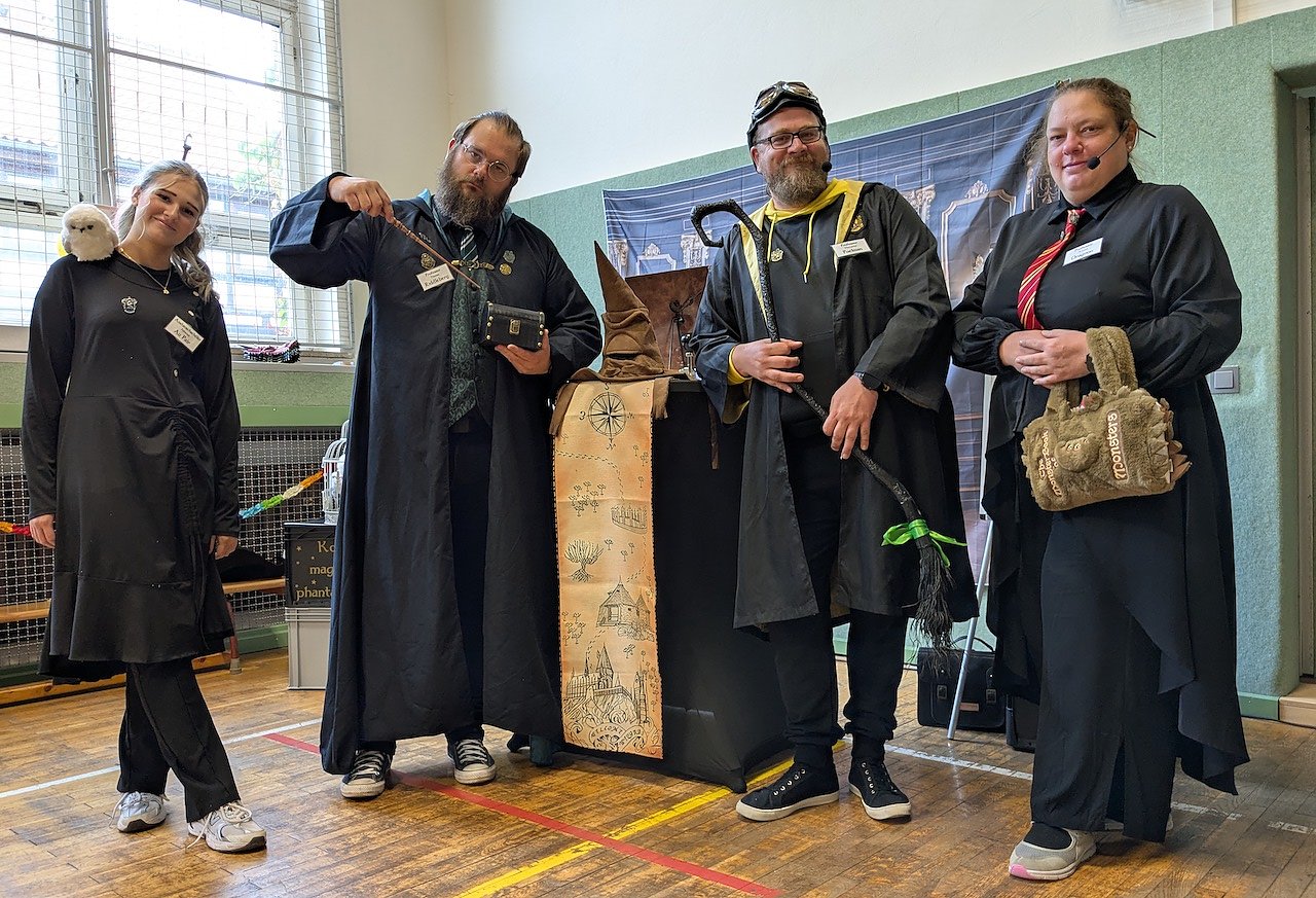 Thomas (Prof. Thomas Riddleburg), Steffi (Dragoon), Mirko (Prof. Mercurius Poelman) und Fabienne (Au Pair-Mädchen, Vertrauensschülerin ) aus dem Happylino waren in die Turnhalle gekommen und bereiteten für die Kinder ein trimagisches Turnier vor. Verkleidet als echte Zauberlehrer und mit Hilfe jeder Menge magischer Accessoires eröffneten sie das Spektakel. Ein Hut, der sprechen konnte, erklärte den Kindern, was sie erwartet.