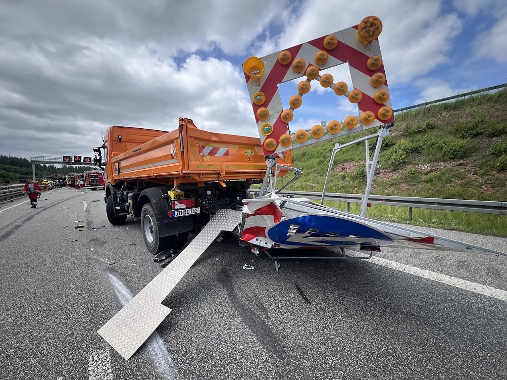 Dabei wurde der Schilderwagen zerstört, der Unfall- LKW geriet nach links von der Fahrbahn, prallte beim Gegenlenken in die rechte Leitplanke und stürzte um.