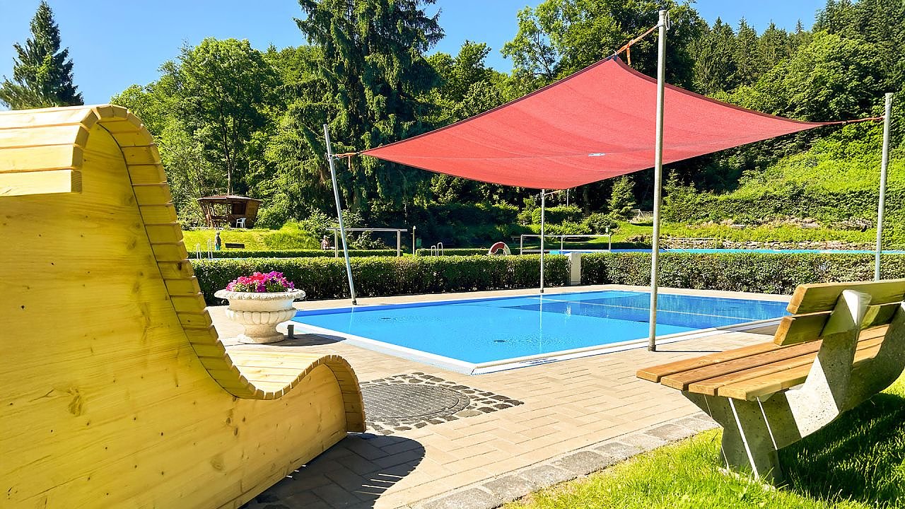 Ein leuchtend rotes Sonnensegel spendet großzügig Schatten und schützt die empfindliche Kinderhaut an heißen Tagen. Rundherum sorgt das naturbelassene Ambiente des Waldbades für eine entspannte Atmosphäre: gepflegte Liegewiesen, Blumen, Bäume und Bänke schaffen einen idealen Ort zum Durchatmen.