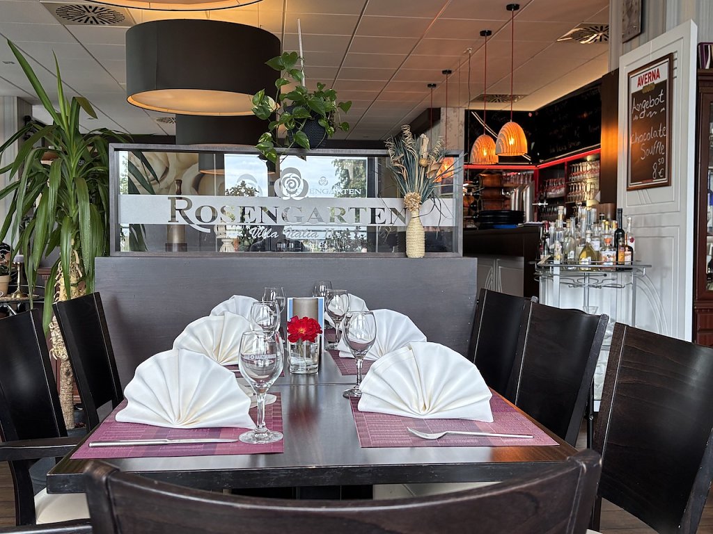 Neben dem Restaurant mit 130 Plätzen und einem separatem Saal für weitere 90 Gäste verfügt der Rosengarten nun über eine moderne, überdachte Terrasse, wo knapp 90 Besucher Platz finden und feinstes Münchner Hofbräu Bier aus dem Zapfhahn oder den schwarzen Thüringer Klassiker aus Köstritz genießen können. Alle drei Räumlichkeiten sind für Feiern und Veranstaltungen aller Art bestens geeignet; seien es Hochzeiten, Vereinssitzungen, Klassentreffen oder Trauerfeiern. Schließlich weist auch das Weinregal des Hauses ein umfangreiches Repertoire und wahre Schätze auf. Das gut geschulte Personal um den ausgebildeten Restaurantkaufmann Andy Lekaj dekoriert und bedient professionell und bereitet außer italienischen Gerichten auch internationale Gerichte zu. Jeden Freitag brilliert die Küche mit tagesaktuell gefangenem Ostseefisch, der frisch filetiert und zubereitet wird, als Einzelgericht oder Fischplatte mit anderen Spezialitäten. Feinster Grappa oder ein exquisiter Espresso runden jedes Mahl gebührend ab.