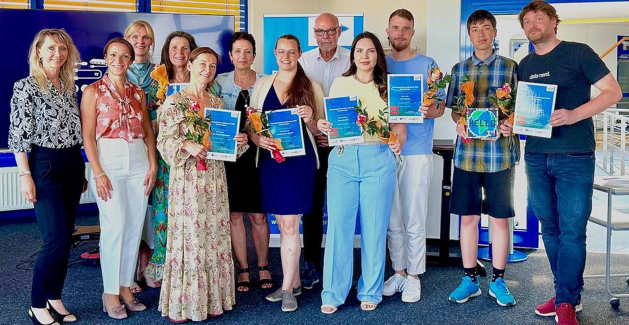Preisträgerinnen und Preisträger GIW 2025 mit den Jurymitgliedern (Foto: S. Kaufmann BIC Nordthüringen)