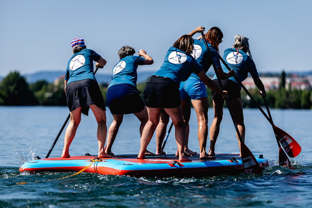 Nach all der sportlichen Höchstleistung wurde es am Nachmittag nochmal richtig unterhaltsam. Das XXL-Board-Rennen, bei dem Teams aus sechs Personen ein sechs Meter langes SUP über den See navigieren mussten, wurde zum Publikumsmagneten. Wasserfontänen, koordinierte Chaos-Kommandos und jede Menge Applaus begleiteten die Rennen. Am Ende gewann der SUP Club Essen Baldenhai knapp vor den Nordhäuser Piraten – doch der Spaß war hier ganz klar das eigentliche Ziel.