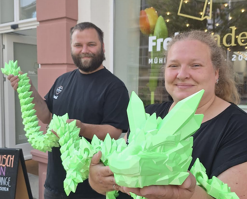 Noch bis Anfang Juli stehen die beiden im Frei.Handel hinter der Theke – mit einem Sortiment, das ganz im Zeichen des 3D-Drucks steht. Besonders beliebt: mystische Drachenfiguren, magnetische Schlangenköpfe und regenbogenbunte Fledermäuse.