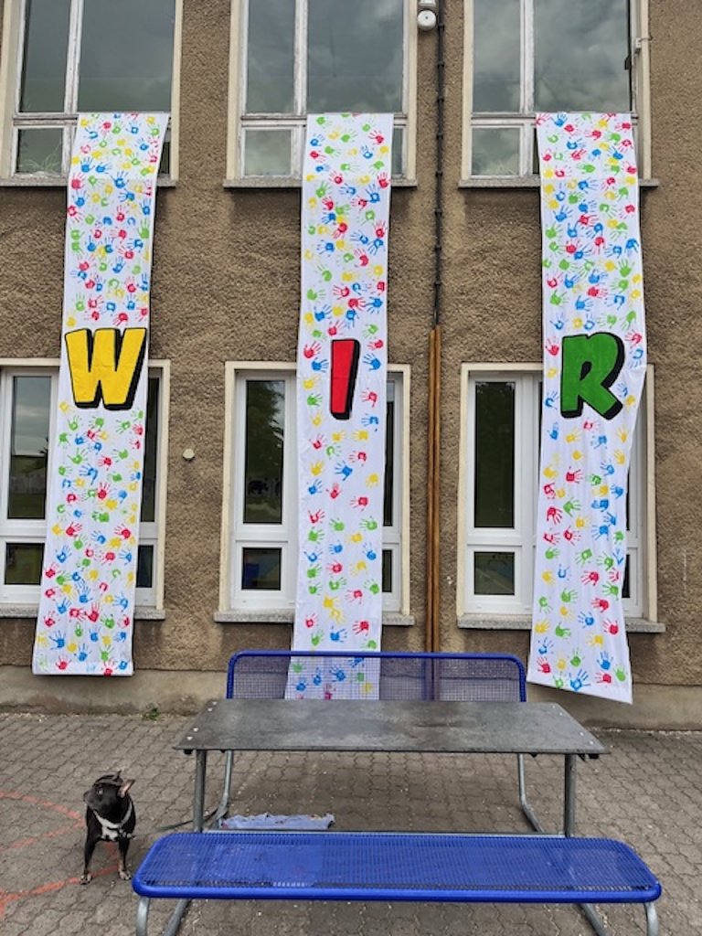 Die anderen Kinder waren dann an den kreativen Stationen beschäftigt. Es wurde also nicht nur getanzt, sondern auch ein Bühnenbild gestaltet. Drei riesengroße Banner mit der Aufschrift WIR aus weißen Tischtüchern, gesponsert von Miettischdecke.de, bekamen eine Vielzahl von bunten Handabdrücken der Kinder. Die Erzieherin Frau Siebenhüner war für die Station zuständig, denn sie nähte schließlich auch die Tischtücher als Banner zusammen.