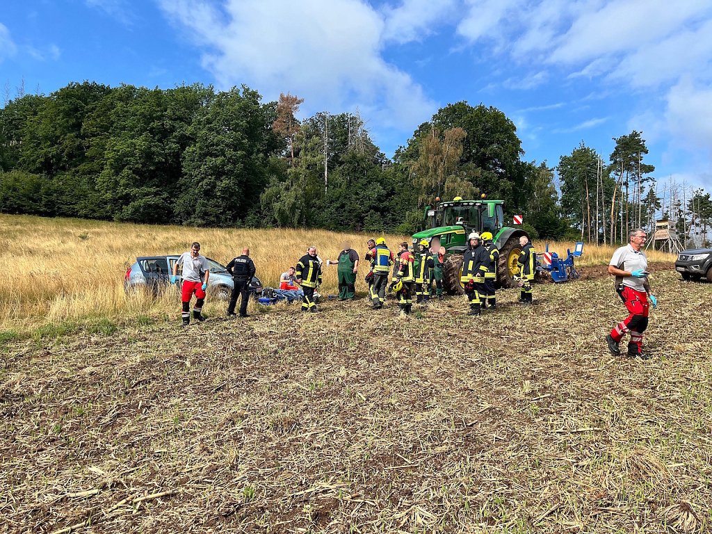 Nahe der Ortslage Auleben war ein Auto auf einer abschüssigen Wiese festgestellt worden. Der im Auto befindliche Fahrer musste vor Ort medizinisch versorgt werden. Er kam zur weiteren Behandlung in ein Krankenhaus. Da das Gelände schwer zugänglich war, unterstützten örtliche Landwirte die Einsatzkräfte der Polizei mit geeignetem Gerät, um die Einsatzstelle zu erreichen.
