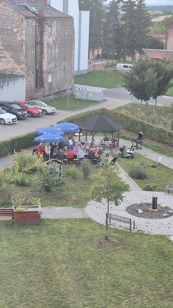 Ein ganz grosses Danke schön geht an das Kulturhaus Bleicherode für die Bereitstellung der Sitzgelegenheiten und der WBG Südharz für den Verleih der Sonnenschirme. Der selbst gebackene Kuchen der Bewohner kam sehr gut an, selbstgemachte Salate rundeten den Grillabend bei Würstchen und Steaks ab.