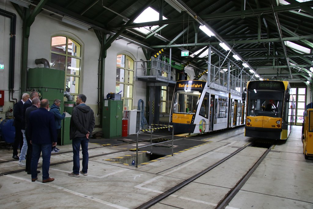 Technologieoffen soll nach Lösungen gesucht werden, so der Minister weiter, es gelte die goldene Mitte zu finden. Unter anderem erprobt man auf einer Teilstrecke den Batteriebetrieb, in Nordhausen läuft der Combino Duo seit langem erfolgreich mit einem Dieselaggregat. Zum Nordhäuser Modell ließ sich Schütz detailreich informieren und durfte auch einmal unter eine der Nordhäuser Bahnen klettern. Zu den Informationen gehört auch, dass die Kleinserie der Diesel-Hybride in der Anschaffung recht teuer ist und man in Zukunft sehen müsse, was der Markt hergibt, gab Straßenbahnchef Thorsten Schwarz zu bedenken. Auch eine Elektrifizierung von Bahnstrecken ist denkbar, entscheidend ist, was die Kostenrechnung am Ende ergibt.