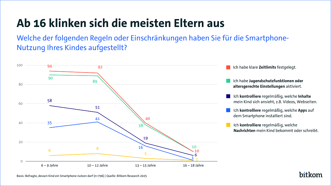 Wenig überraschend: Je älter ein Kind ist, desto mehr Freiheiten geben Eltern bei der Smartphonenutzung: Nur noch 40 Prozent der Eltern von 13- bis 15-Jährigen, die ein Smartphone nutzen, geben dafür Zeitlimits vor, 38 Prozent aktivieren Jugendschutzfunktionen bzw. altersgerechte Einstellungen. Nicht mal jeweils jedes fünfte Elternteil kontrolliert bei 13- bis 15-Jährigen angesehene Inhalte (19 Prozent), Apps (16 Prozent) oder Nachrichten (3 Prozent) auf dem Smartphone. Bei den 16- bis 18-Jährigen geben jeweils nur noch 10 Prozent der Eltern Zeitlimits und altersgerechte Einstellungen vor.