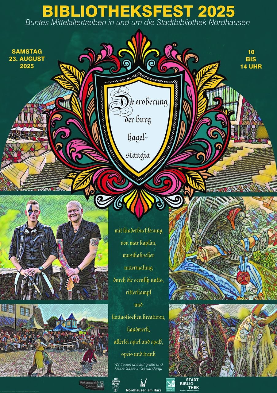 Reise ins Mittelalter. Daher freuen wir uns an diesem Tag auf die Ritterschaft zu Reychenfels, Musik von den Scruffy Mutts, die Fabelwesen von Schattenwelt Südharz, den Kinderbuchautor Max Kaplan und die vielen Akteure, die ein buntes mittelalterliches Treiben ermöglichen, so Marie-Kathrin Haase, Leiterin der