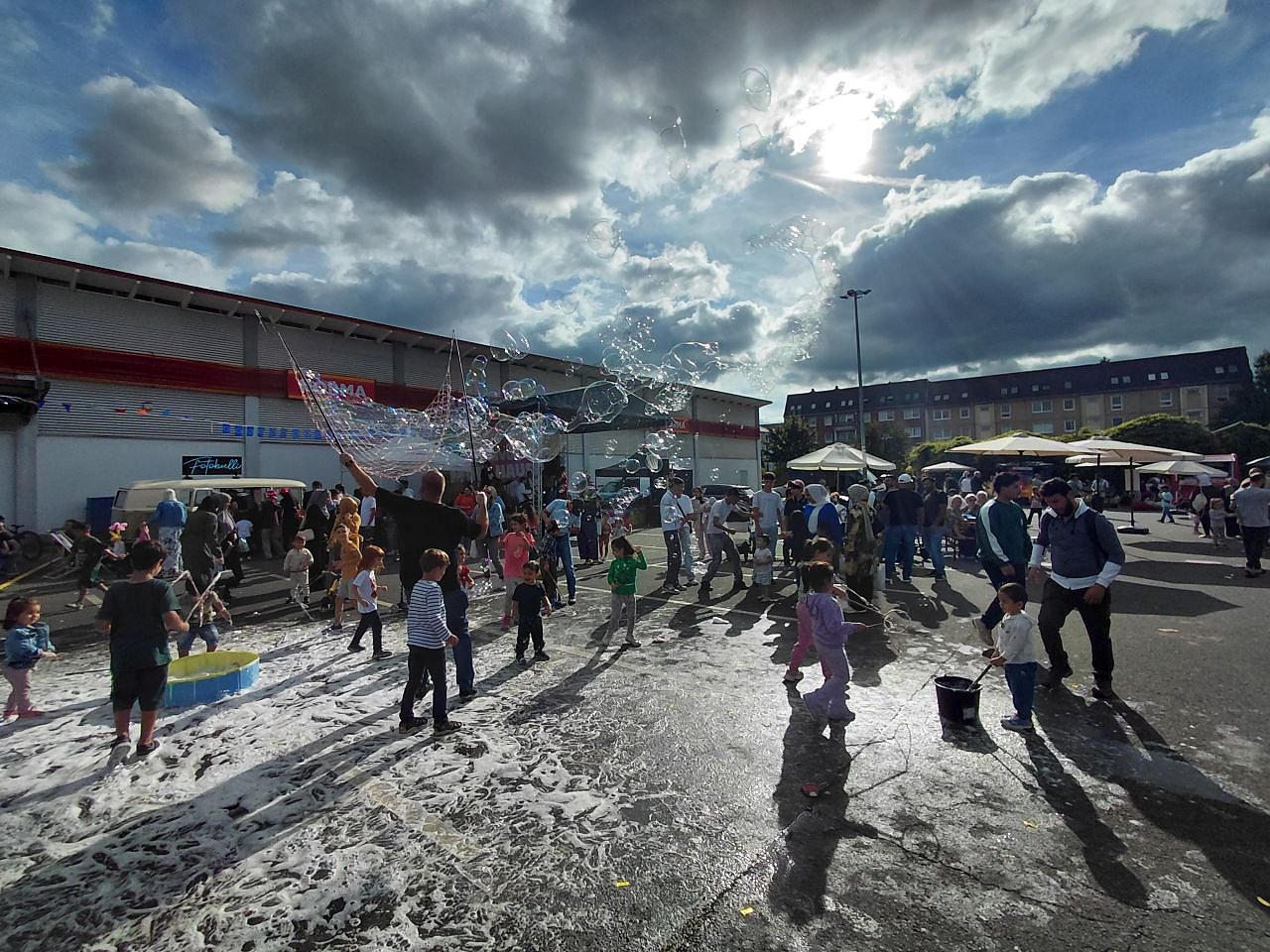 Während die Stände teilweise noch im Aufbau waren, gab es bereits beschwingte Livemusik von der Band Brise Manouche. Nach und nach trudelten zahlreiche Familien aus den Häusern der näheren Umgebung ein und vor allem die dutzenden Kinder und Jugendlichen trafen viele Freunde. Verschiedene soziale Träger hatten circa 20 Mitmachangebote vorbereitet, welche rege genutzt wurden.