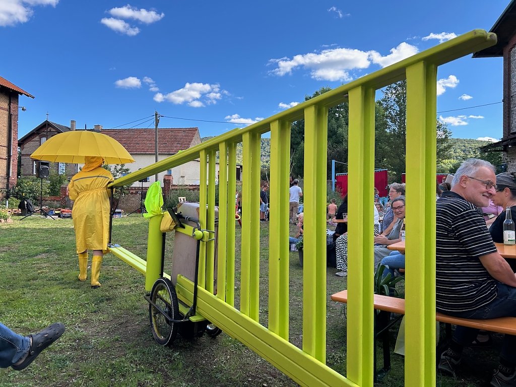 Am Samstag ging es ohne Gretchenfragen weiter, sowohl auf dem Hof als auch im Haus konnten verschiedene Vorstellungen bestaunt werden. Jana Korb nutzte die Gelegenheit, um mit ihrem neuem Stück, der "Regenleiter" Premiere für ein "Allwetterstück" zu feiern.