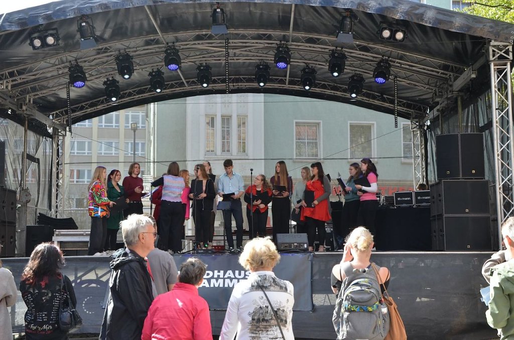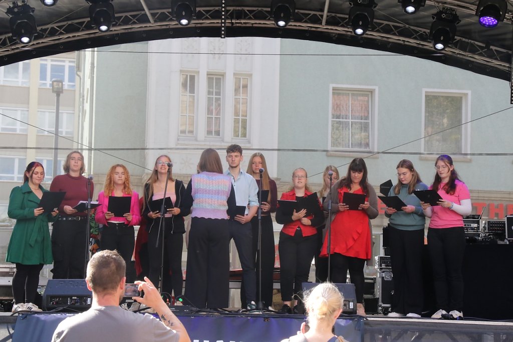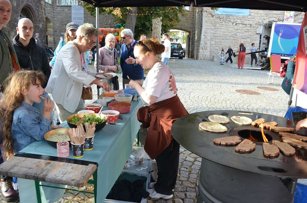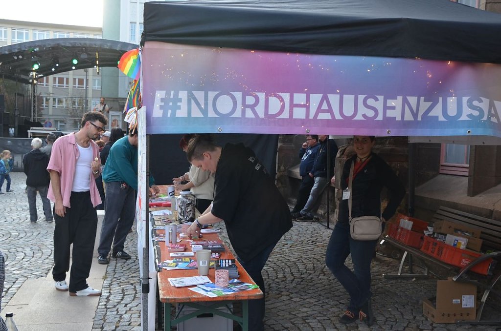 Mit Musik, gutem Essen, Spiel- und Spaß für die Kleinen und Redebeiträgen wie dem Hammers sichert man sich ab gegen die Einsamkeit der Sorge und will frohen Mutes feiern. Auf der Bühne stehen Menschen aus Nordhausen, etwa der Chor der pro vita der eine Ode an den Frieden zum Besten gab, wie auch Menschen die es hierher verschlagen hat, wie vier junge Mädchen aus der Gemeinschaftsunterkunft in Sülzhayn, die sich zum tanzen auf die Bühne getraut haben.