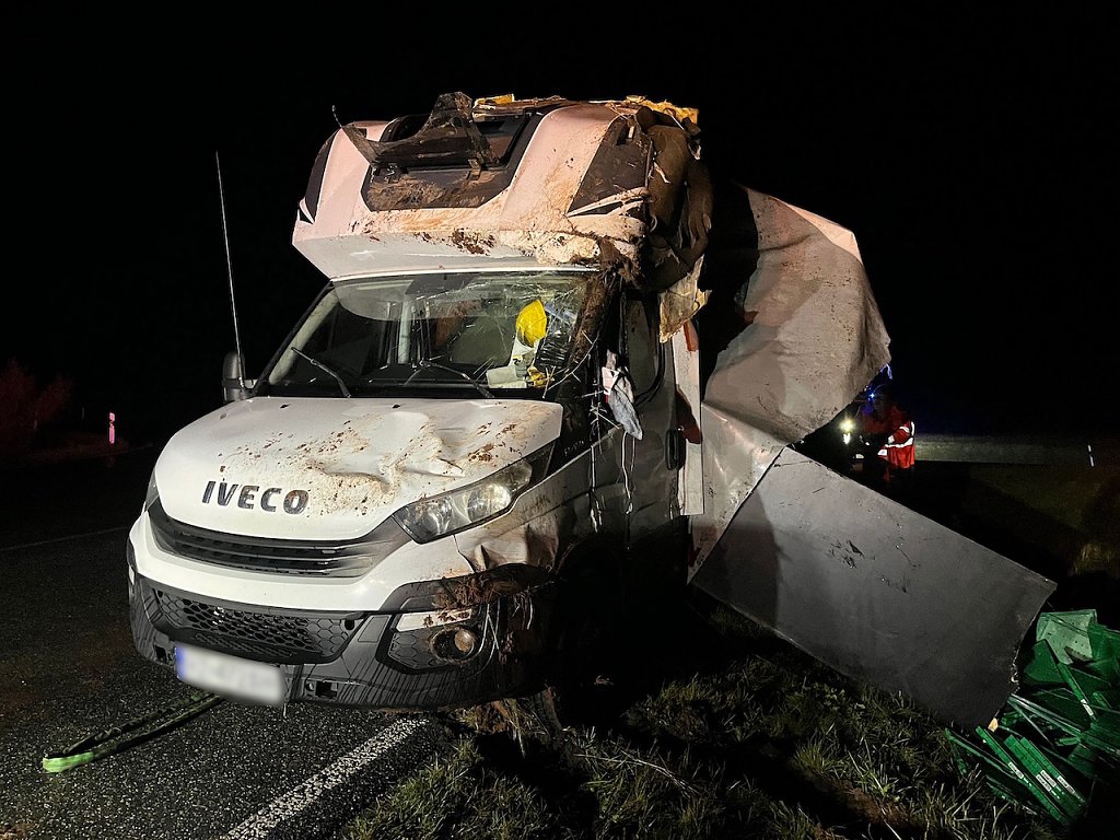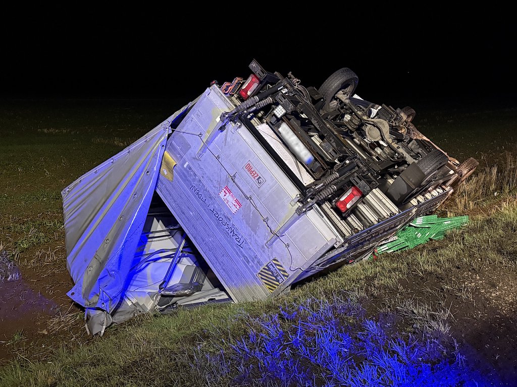 Aus bisher ungeklärter Ursache kam der Fahrer in einer Rechtskurve nach links von der Fahrbahn ab, das Fahrzeug rutschte die Böschung hinunter und blieb auf dem Dach auf einem Acker liegen. Nach eigenen Angaben des Fahrers hatte er mit der schlechten Sicht durch den Regen sowie mit dem böigen Wind zu kämpfen.