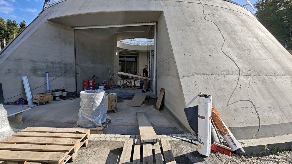 Nun stehen die Bauarbeiten kurz vor dem Ende, denn ab 1. Oktober soll die Erlebniswelt geöffnet sein. Zahlreiche Gewerke sind noch zu Gange und der Laie wie der Autor hat leise Zweifel ob der rechtzeitigen Fertigstellung. Gunnar Reuter, Geschäftsführer der Service GmbH und Standortleiterin Veronika Töpfer wissen um den Zeitdruck, sind trotzdem optimistisch. Es ist in der Tat ein Erlebnisreich geworden, das wir den künftigen Besuchern anbieten können”, sagt Reuter und Veronika Töpfer ergänzt: Zur Erlebniswelt gehört ja nicht nur der Turm mit seiner interaktiven Erlebniswelt im unteren Bereich, dazu gehören zum Beispiel auch ein Hexenzauberhaus, ein Kristallbergwerk oder eine Hexenflugschule und das alles barrierefrei.” Und der Besen? Der misst ganze 77 Meter und hat eine 100 Meter lange Rutsche. In 43 Meter Höhe befindet sich die Aussichtsplattform. Die kann man zu Fuß erklimmen oder man lässt sich mit dem eingebauten Fahrstuhl nach oben fahren.