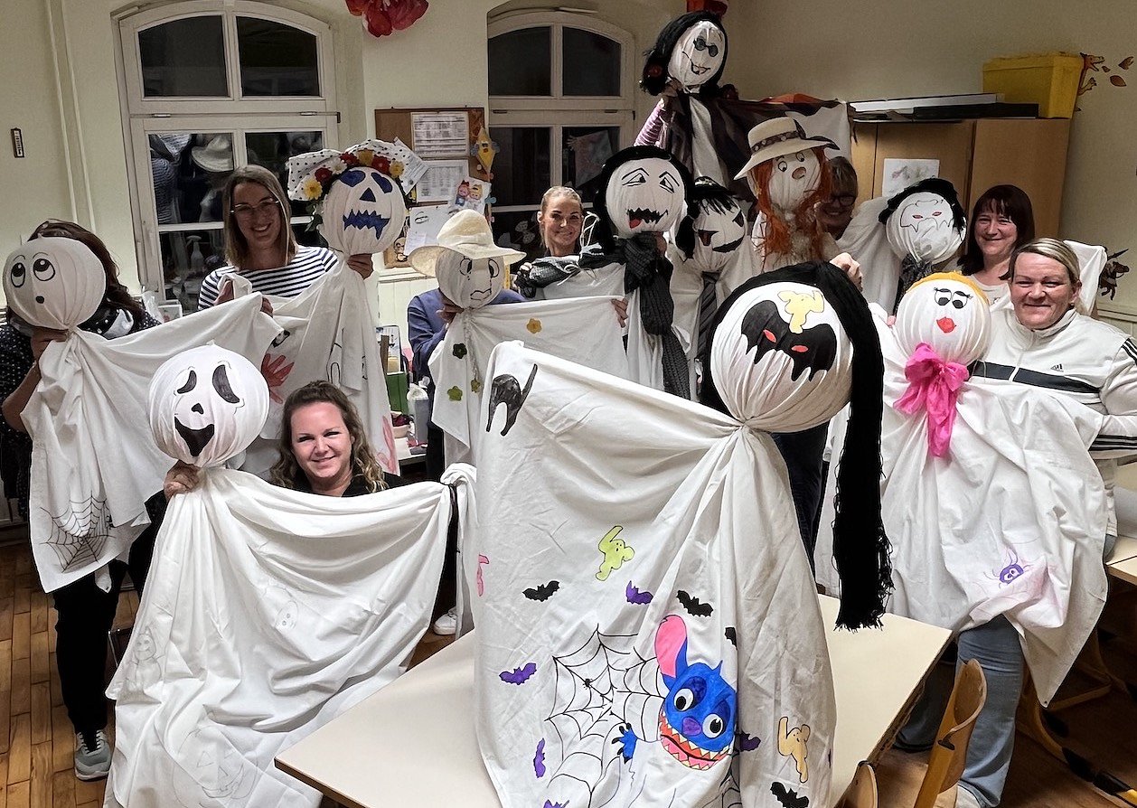 Es war also an der Zeit. Die Idee für einen gemeinsamen Bastelabend entstand. Im Vorfeld gab es ausreichend Spenden an Bettlaken, Tischtüchern, Wasserbällen, Krawatten, Hüten & Co. Herzlichen Dank dafür. Das sollten schließlich fröhliche kleine Gespenster werden.