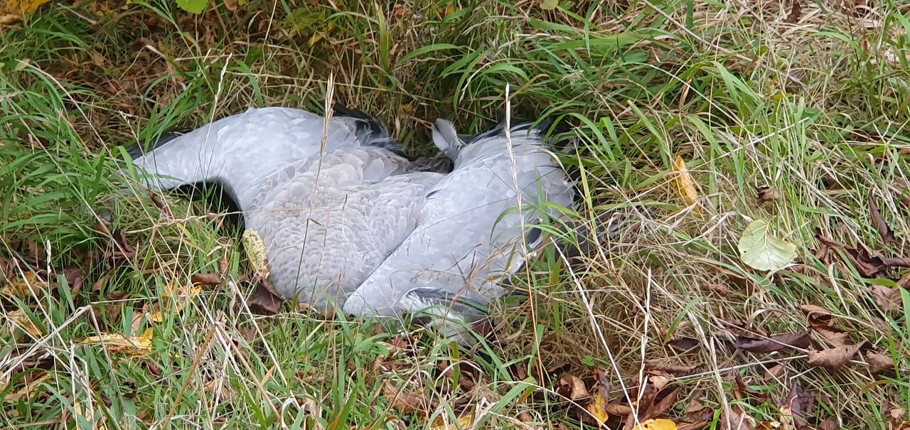 Dennoch lag plötzlich ein sterbender Kranich mehrere Meter entfernt vor mir im Gras am Wegrand. Zunächst dachte ich, er sei tot, stellte dann aber fest, dass er noch versuchte, seinen Kopf zu heben, was ihm kaum gelang. Ich bin kein Jäger, aber ich hätte das Tier gern von seinen Qualen erlöst. Ob es die informierten Behörden noch am Abend erreichten, entzieht sich meiner Kenntnis.