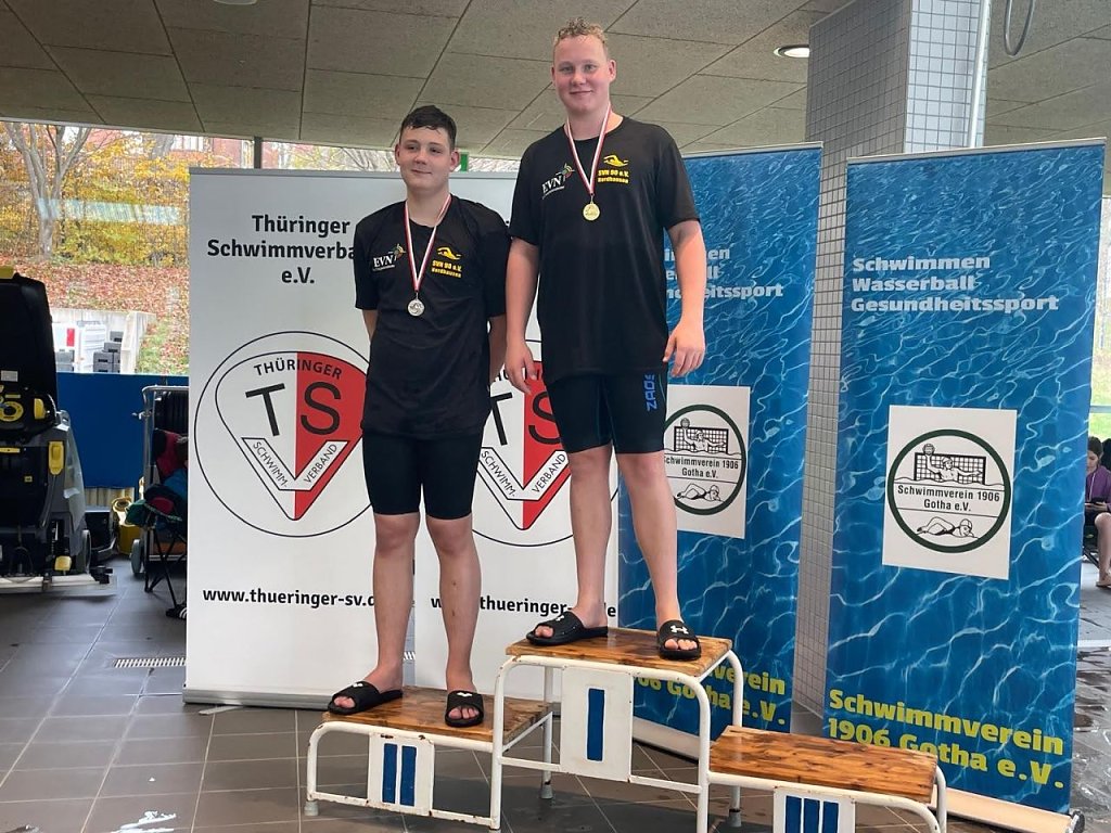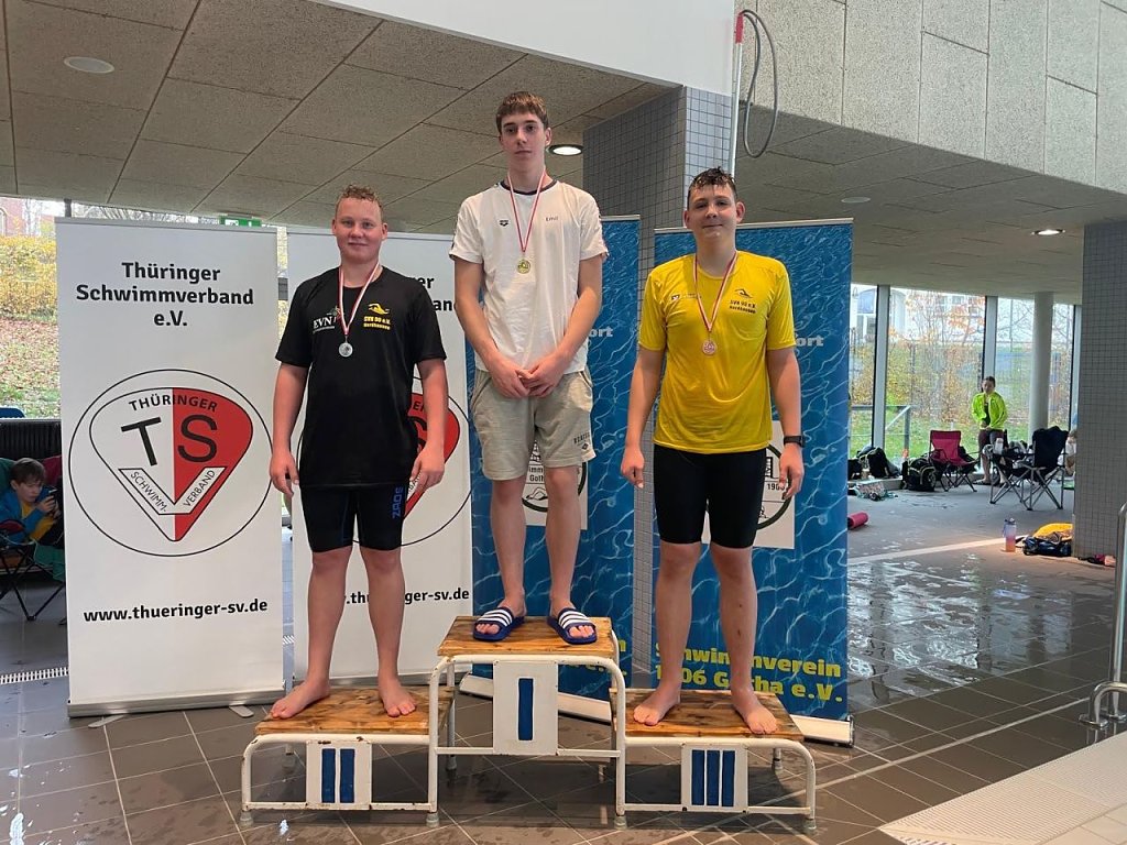 Henry Schaefer (JG 2010) schwamm 2-mal in seiner Hauptlage zum Thüringer Jahrgangsmeister in 100 m und 200 m Delphin. In 200 m Delphin belegte Henry im offenen Finale noch Platz 5. Tom Falke (JG 2010) siegte in 50 und 100 Meter Rücken und wurde somit Thüringer Jahrgangsmeister. Silber holte er sich in 50, 100 und 200 m Brust, in 200 m Freistil und 200 m Rücken. Auch er stand im offenen Finale mit 200 m Freistil. Paul Höpfner (JG 2010) unterstützte die Mannschaft am ersten Wettkampftag durch seinen Einsatz als Kampfrichter. Am 2. Tag ging Paul 4-mal an den Start und stand auch 4-mal auf dem Treppchen- Gold und Thüringer Jahrgangsmeister in 200 m Brust, Silber in 100 m Rücken und 200 m Freistil und Bronze in 50 Brust. Mit der Leistung in 200 m Brust gab es noch den Startplatz im offenen Finale.