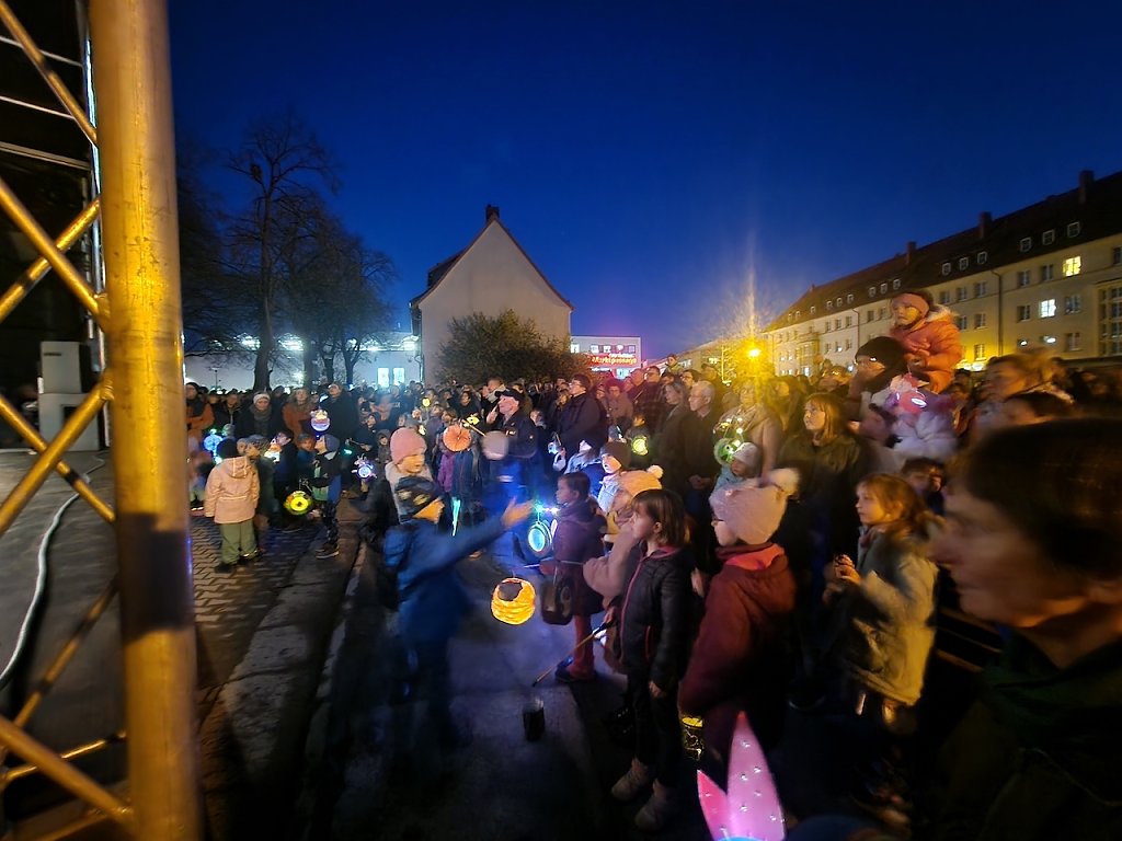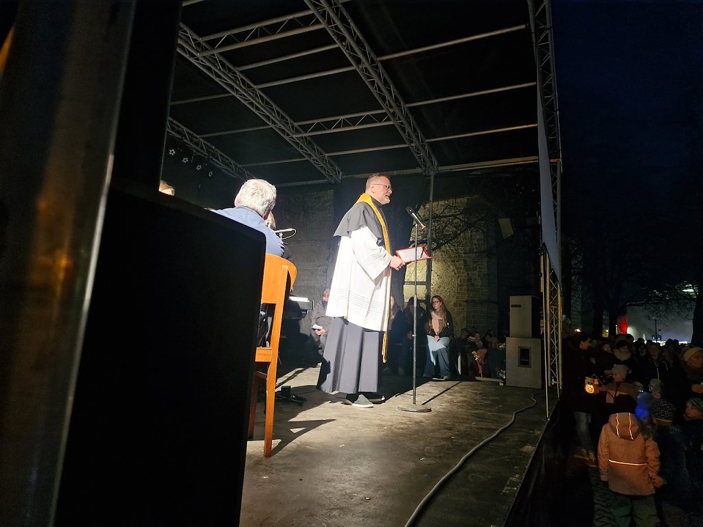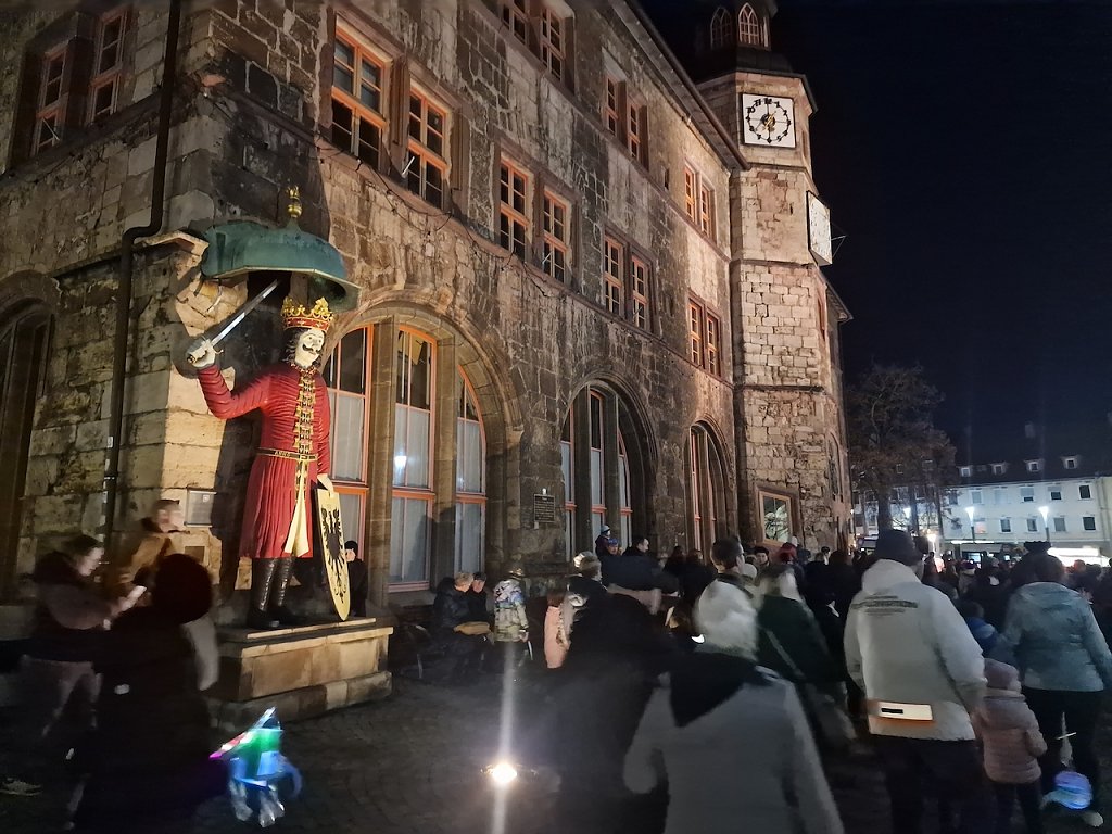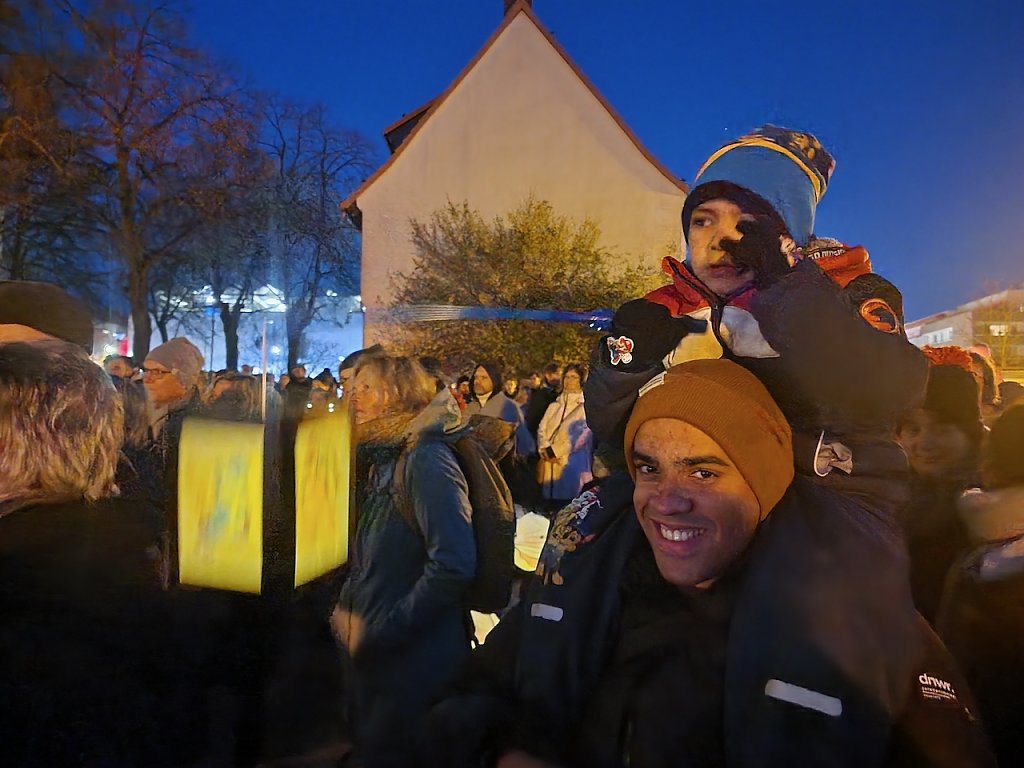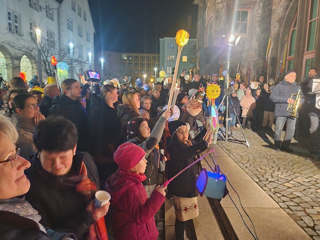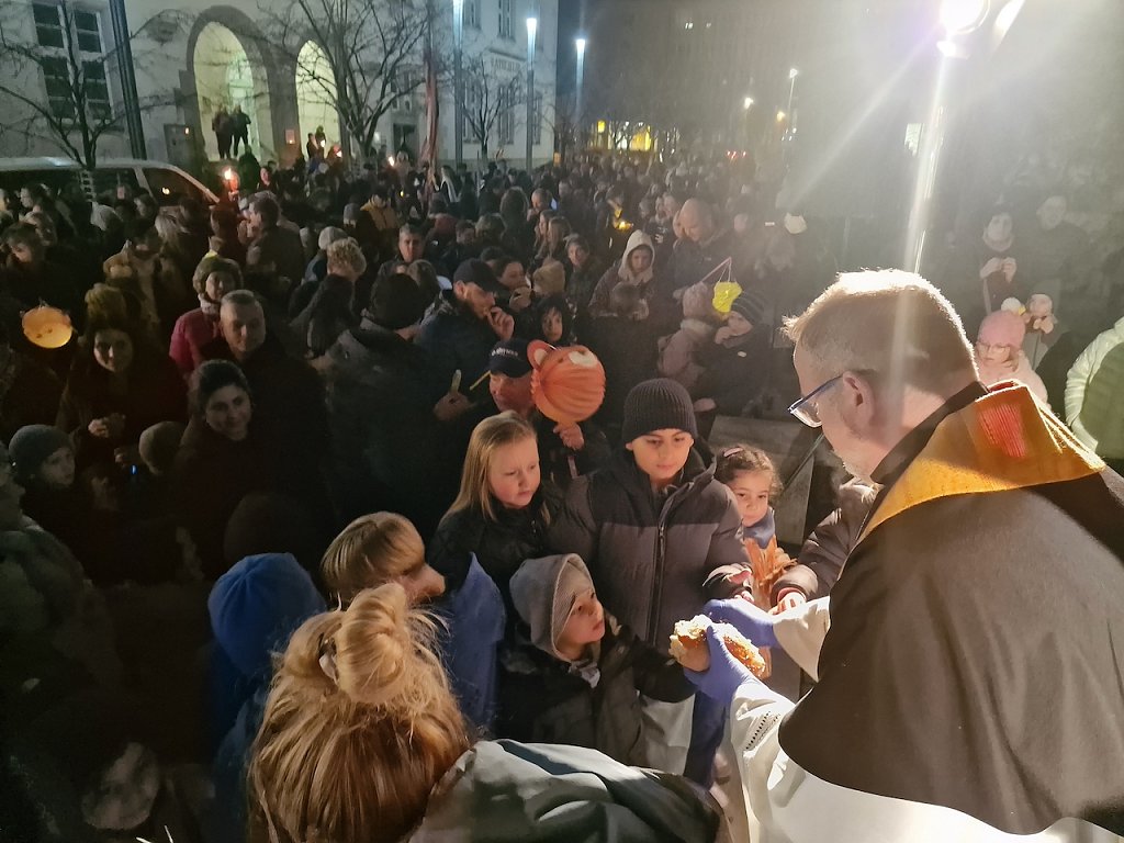 Mit dem letzten Tageslicht begann am späten Nachmittag die traditionelle Martinifeier vor der Blasiikirche. Im ökumenischen Gottesdienst wurde die Martinsgeschichte erzählt und gesungen, danach ging es im Lichterzug auf den Rathausplatz, wo die Brezeln geteilt und das Feuerwerk bestaunt werden konnte.