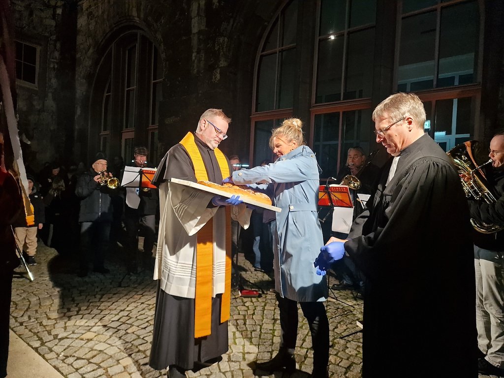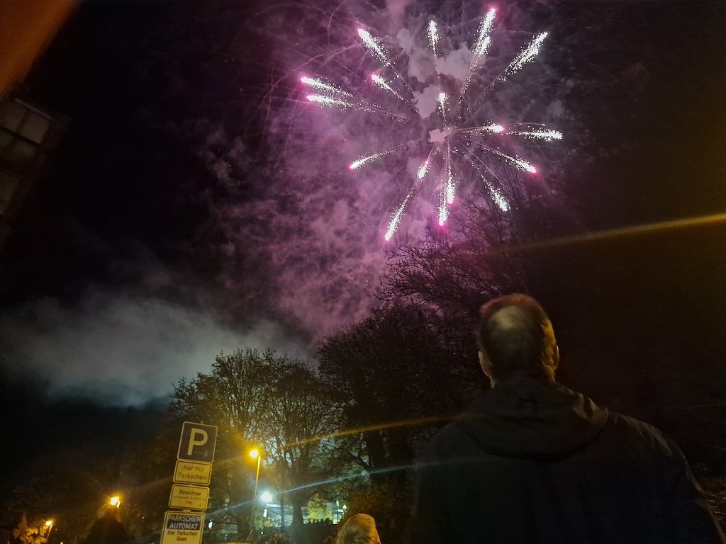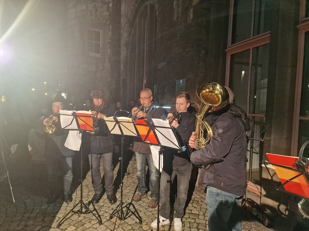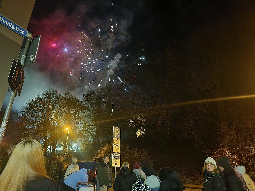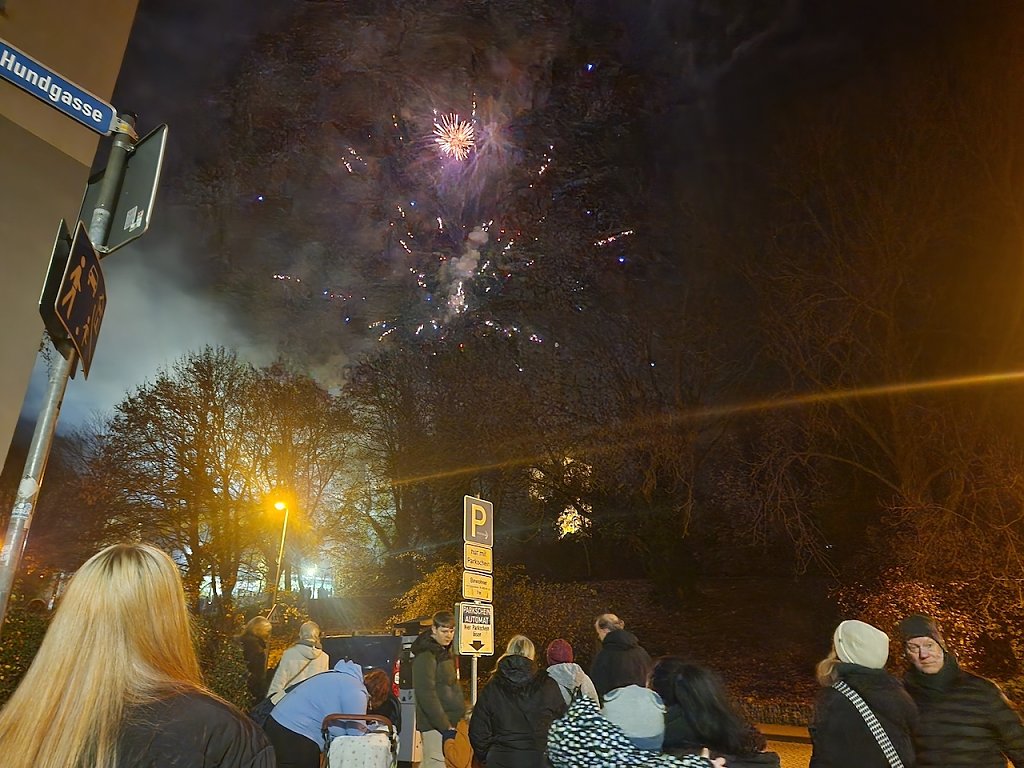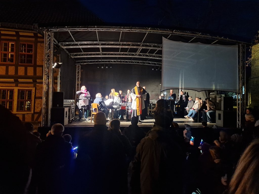 Mit dem letzten Tageslicht begann am späten Nachmittag die traditionelle Martinifeier vor der Blasiikirche. Im ökumenischen Gottesdienst wurde die Martinsgeschichte erzählt und gesungen, danach ging es im Lichterzug auf den Rathausplatz, wo die Brezeln geteilt und das Feuerwerk bestaunt werden konnte.