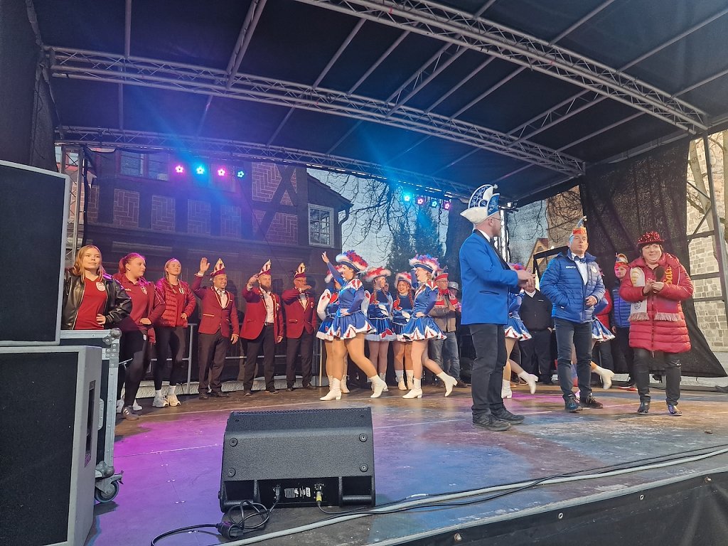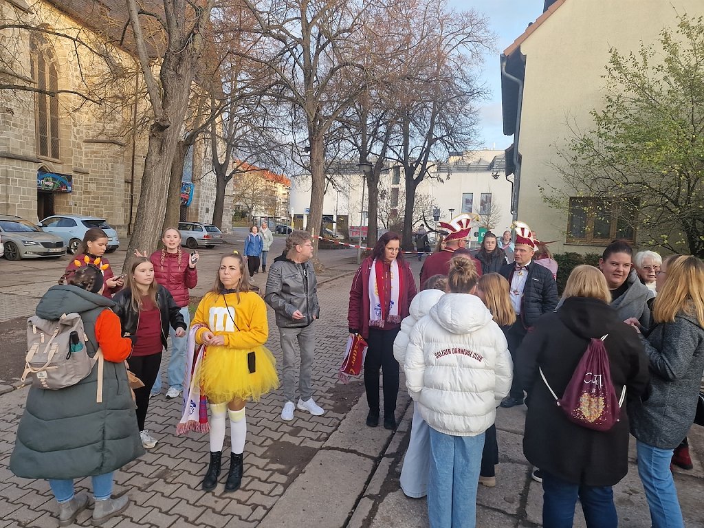 Mit ein paar Stunden Verspätung wurde heute um 16.11 Uhr auch in Nordhausen die Karnevalssaison eröffnet. An der Blasiikirche stand die Bühne für das gestrige Martinsfest noch, genau der richtige Platz für die Clubs aus Salza, Krimderode und Leimbach, den Stadtschlüssel aus den Händen von Bürgermeisterin Rieger zu erhalten und gemeinsam einen ersten Vorgeschmack auf die anstehenden Feierlichkeiten zu geben.