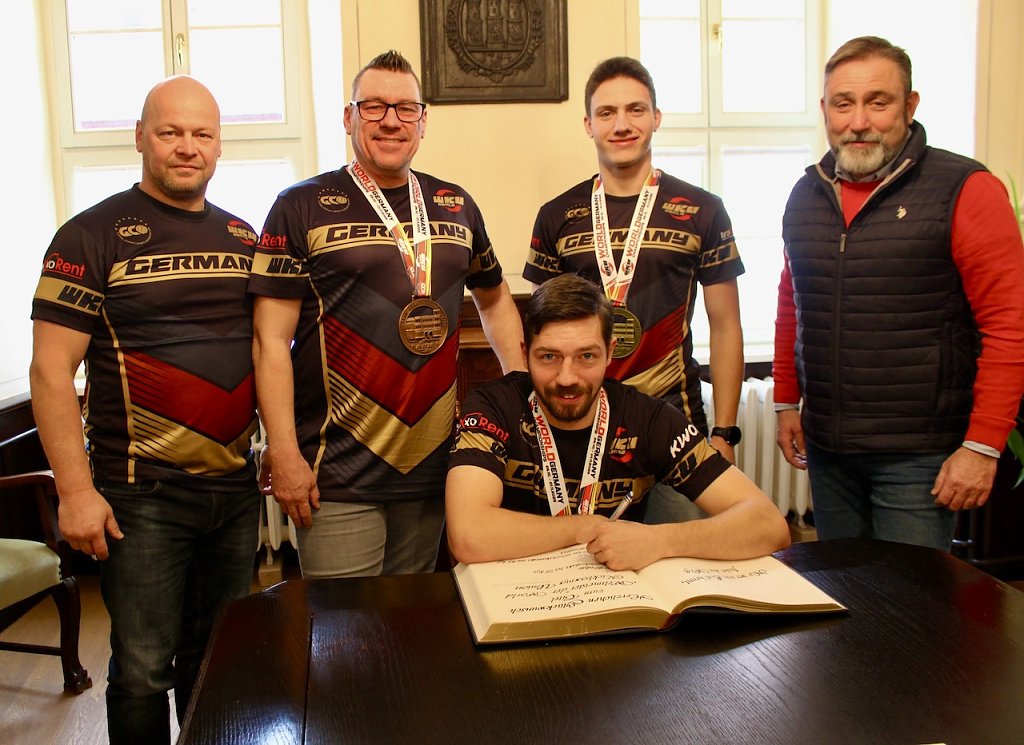 Tom Ochmann, Kristian Böttger, Weltmeister Neo Legde, Nico Leifeld und Bürgermeister Matthias Reinz heute Vormittag beim Eintrag ins Goldenen Buch der Stadt (Foto: Eva Maria Wiegand)