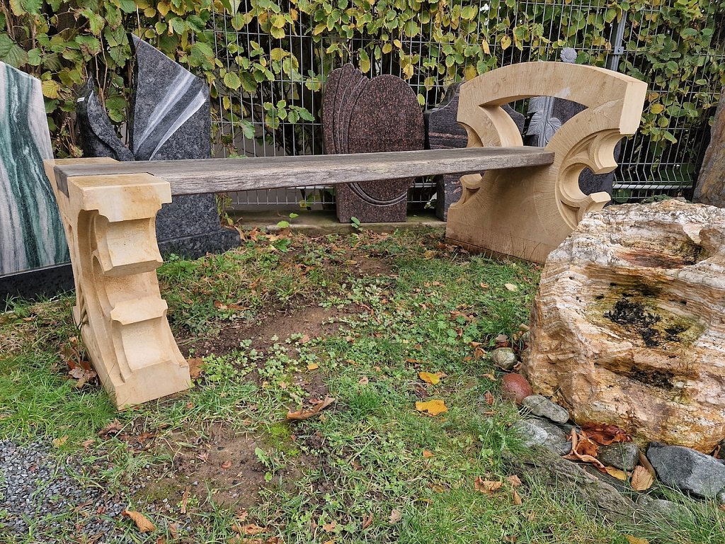 Filigrane Blumenmuster, Ranken, Laubwerk oder Sternenhimmel, sanfte Schwünge, klare Kanten, Inschriften, feinste Ornamentik und inzwischen sogar eingearbeitete Fotografien gehören genauso zum Alltag, wie das herumwuchten riesiger Steinquadrate in der Werkstatt und der grobe Zuschnitt von Bänken, Säulen, Treppenanlagen, Arbeitsplatten und natürlich Grabsteinen.