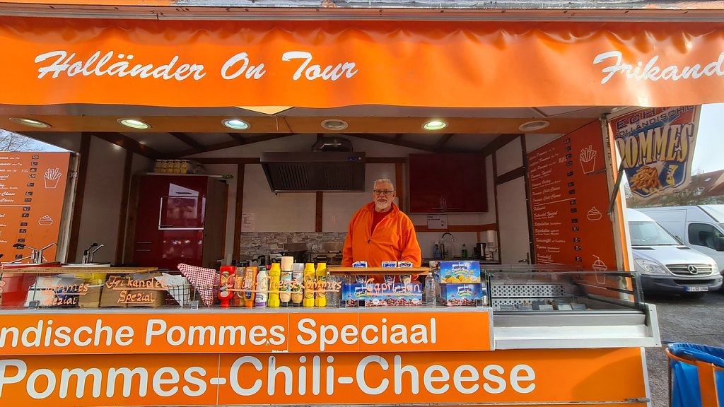 Als erstes komme ich mit Ludwig ins Gespräch. Er betreibt den Stand mit den Holländischen Pommes. Zum Marktschreien ist der 78-Jährige Bochumer durch seine Frau gekommen. "Wir hatten in Holland, der Heimat meiner Frau, einen Imbiss und nachdem meine Frau vor vier Jahren verstorben ist, habe ich beschlossen, alleine durch das Land zu ziehen. Was soll ich zu Hause sitzen? Das ist nichts für mich! Er ist nicht nur in Deutschland unterwegs, sondern auch in Österreich und der Schweiz.