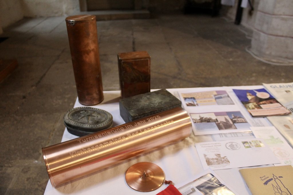 Die Einlegung der Dokumente in die Zeitkapseln 2025 bereiteten Gemeindemitglieder und lokale Vertreter von Gesellschaft und Verwaltung gemeinsam vor. Neben einer gedruckten Tageszeitung, einer Kirchenzeitung mit Bezug auf den Bau, einem Baubericht mit Fotodokumentation sowie einem Bericht des beteiligten Ingenieurbüros zur Sanierung fanden auch mehrere andere Schreiben Eingang in die Kapsel. Briefe des Bürgermeisters und des Stadtrates schildern die heutige Situation in Bad Langensalza, der städtische Numismatikerverein und der Heimat- und Geschichtsverein spendeten einen Satz aktueller Münzen sowie einiger Sonderexemplare und ein Sonderdruck der örtlichen Buchdruckerei im Schlösschenpark sollen zukünftigen Langensalzaern vom Jahre 2025 erzählen.