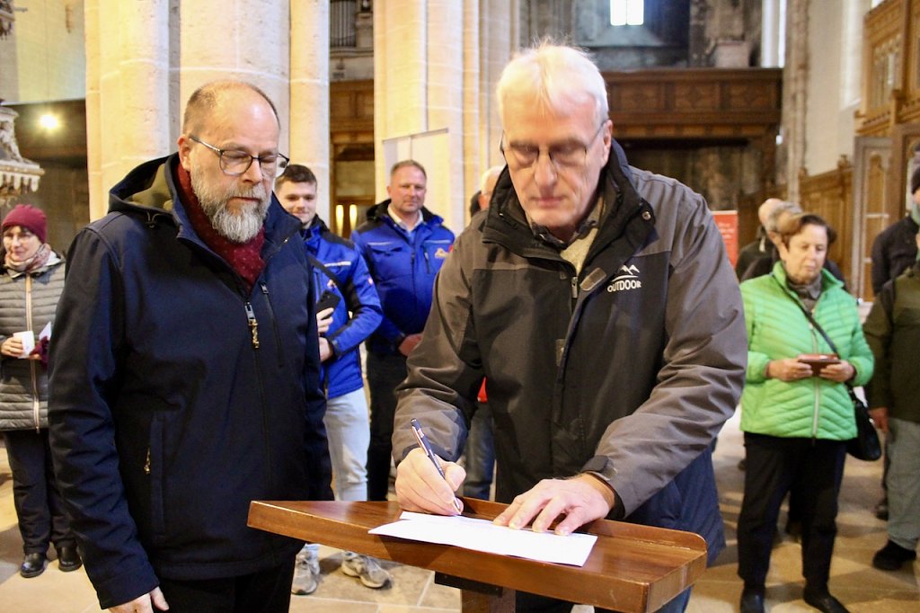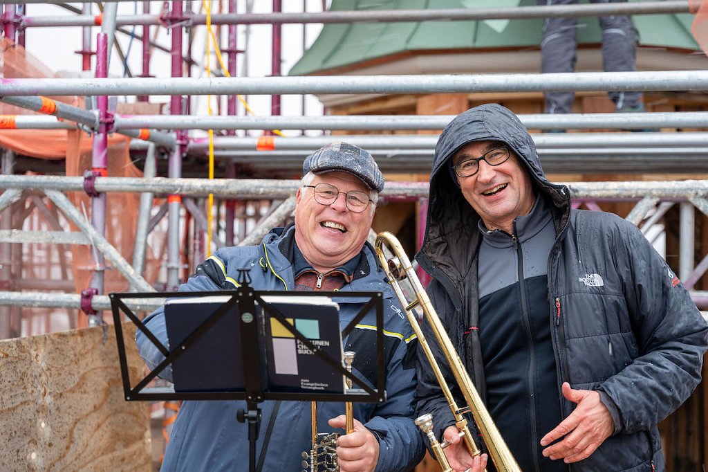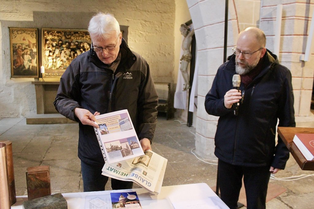 Blechbläser, Glühwein und Christstollen erwarteten heute Vormittag die Besucher und Gäste der feierliche Zeremonie im Kircheninneren. Pfarrer Dirk Vogel bedankte sich bei allen, die durch Tatkraft, kraft ihres Amtes und auch mit Spenden dazu beitrugen, die Kirchturmspitze für die nächsten dreihundert Jahre wieder fit zu machen. Besondere Erwähnung fand Max Horrmann, der als Büroleiter der lokalen Abteilung der Deutschen Stadt- und Grundstücksentwicklungsgesellschaft die entscheidenden Fördermittel organisierte.