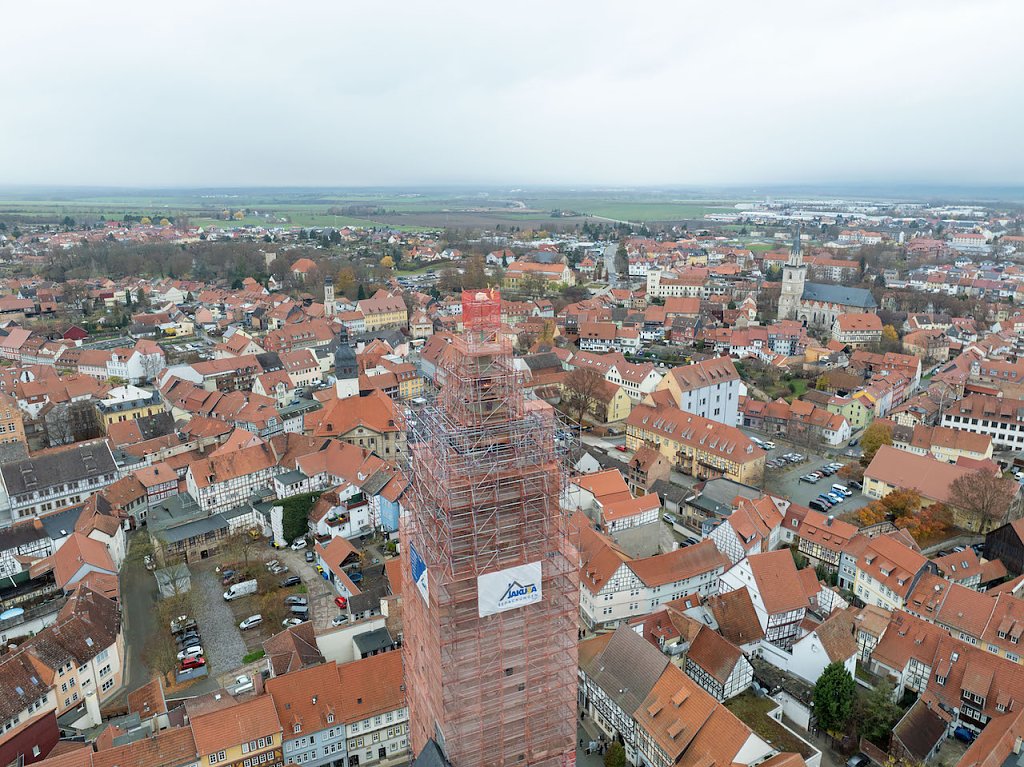 Der Turm der Marktkirche ist das optisch markante und zentrale Bauwerk der Stadt Bad Langensalza mit erheblicher historischer und städtebaulicher Bedeutung. Vorbilder findet der Turm in den sogenannten Belfrieds, den zentralen Stadt- und Kirchtürmen Flanderns aus der Spätgotik und Renaissance oder in Jerusalem. Wann genau das Gerüst wieder abgebaut und der Blick auf den sanierten Turm freigegeben wird, konnte heute noch nicht terminiert werden.