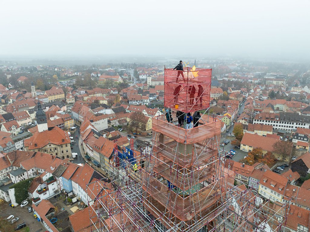 Den Buß- und Bettag hatte sich die evangelische Kirche Bad Langensalzas auserkoren, um in luftiger Höhe von über 70 Metern Zeitkapseln in den Turm der Marktkirche einzufügen, die kommenden Generationen von der heutigen Zeit künden sollen. Uns kündigt die Veranstaltung an, dass die aufwändige Restaurierung des Wahrzeichens der Kurstadt sich dem Ende nähert