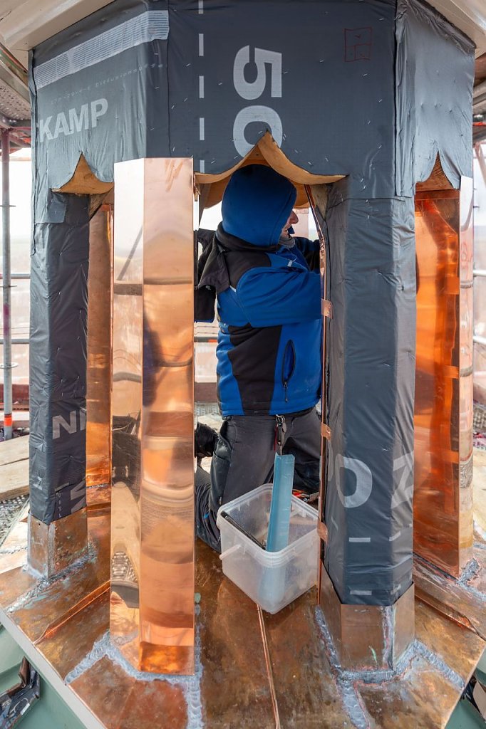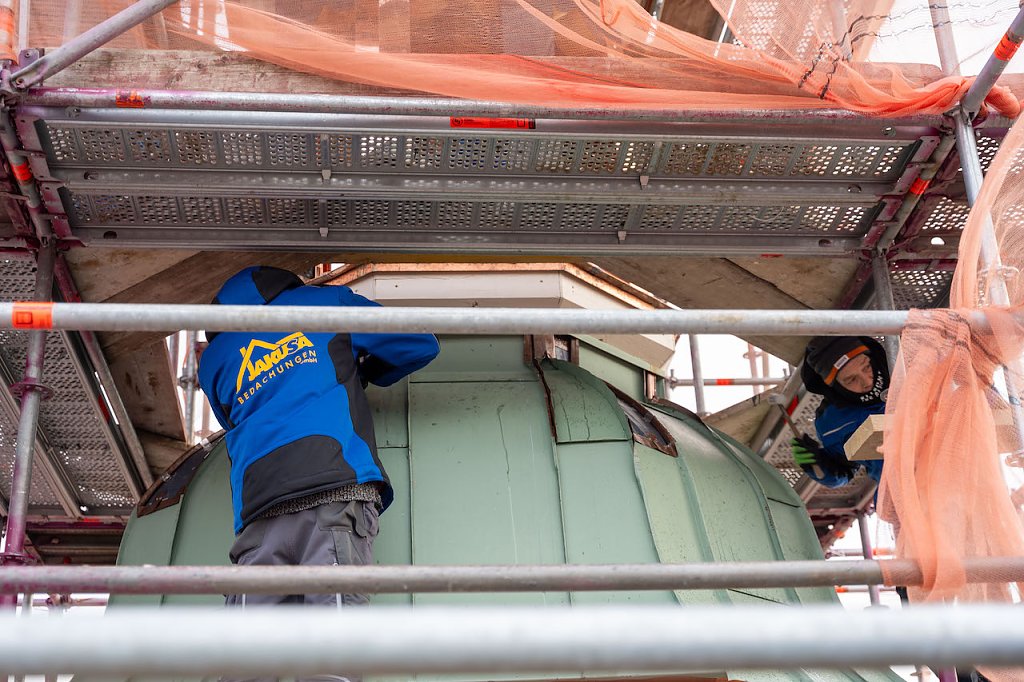Einlegung der Zeitkapsel 2025 in luftiger Höhe auf der Marktkirche in Bad Langensalza (Foto: Eva Maria Wiegand)