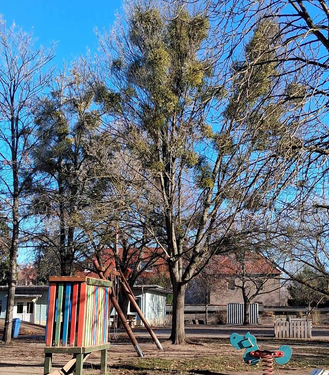 Leider hat viele der dort stehenden verschiedenen Baumarten auch der immergrüne Killer befallen. In einer Häufigkeit, die Schlimmes ahnen lassen. Über kurz oder lang besiegelt er ihren Tod, lässt man den Feind gewähren. Ihm die Chance nehmen, bedeutet Aufwand. Ohne technische Hilfe lassen sich die Misteln nur schwerlich entfernen. Kindergarten und Schule müssen handeln. Die Mühen lohnen: für Kinder und Umwelt.