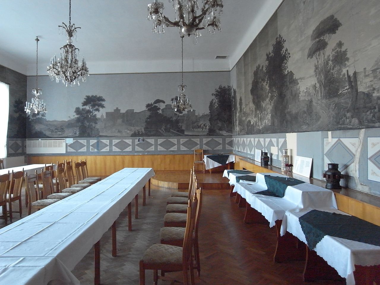 Berühmt ist das Waldhaus wegen der Ausstattung des Saales mit zwei von der Firma Zuber & Companie aus Rixheim im Elsaß 1810 und 1838 in Grisailletechnik mit Handdruckmodeln hergestellten Papiertapeten. Die Motivtapete "L 'Arcadie" entstand nach Entwürfen von Pierre Antoin Mongin und die Wandverkleidung "Les Courses des Chevaux" nach Zeichnungen von Jean Deltil. Vermutlich wurden die Tapeten zwischen 1838 und 1850 angekauft und zeitnah als Attraktion im Saal angebracht.